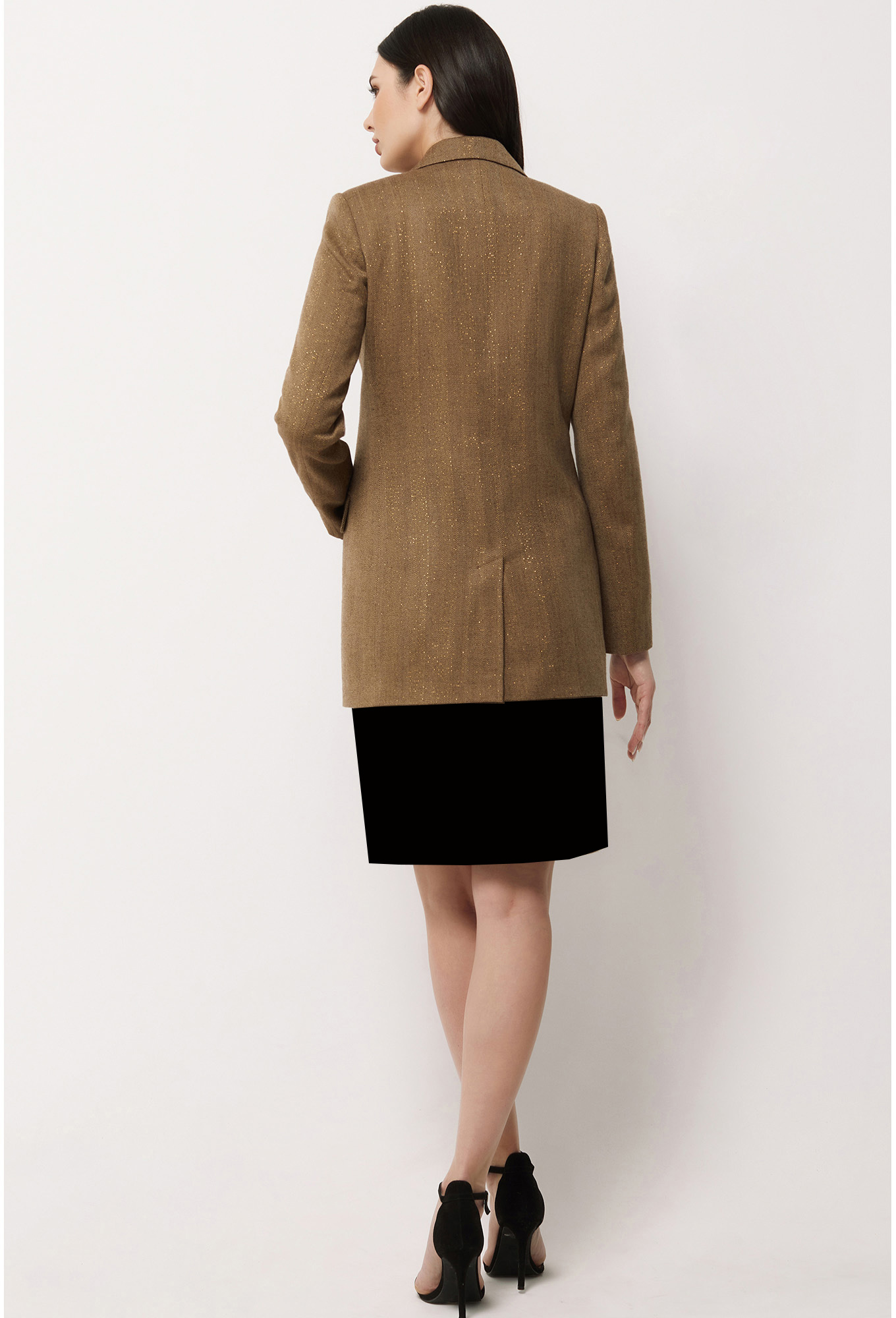 Однобортный жакет прямого силуэта с застежкой на петлю и пуговицу. Перед с двумя карманами с рамками и клапанами и одним карманом-обманкой с рамками и клапаном. Средний шов спинки заканчивается шлицей. Рукава втачные двушовные. Воротник отложной с лацканами. На подкладке.