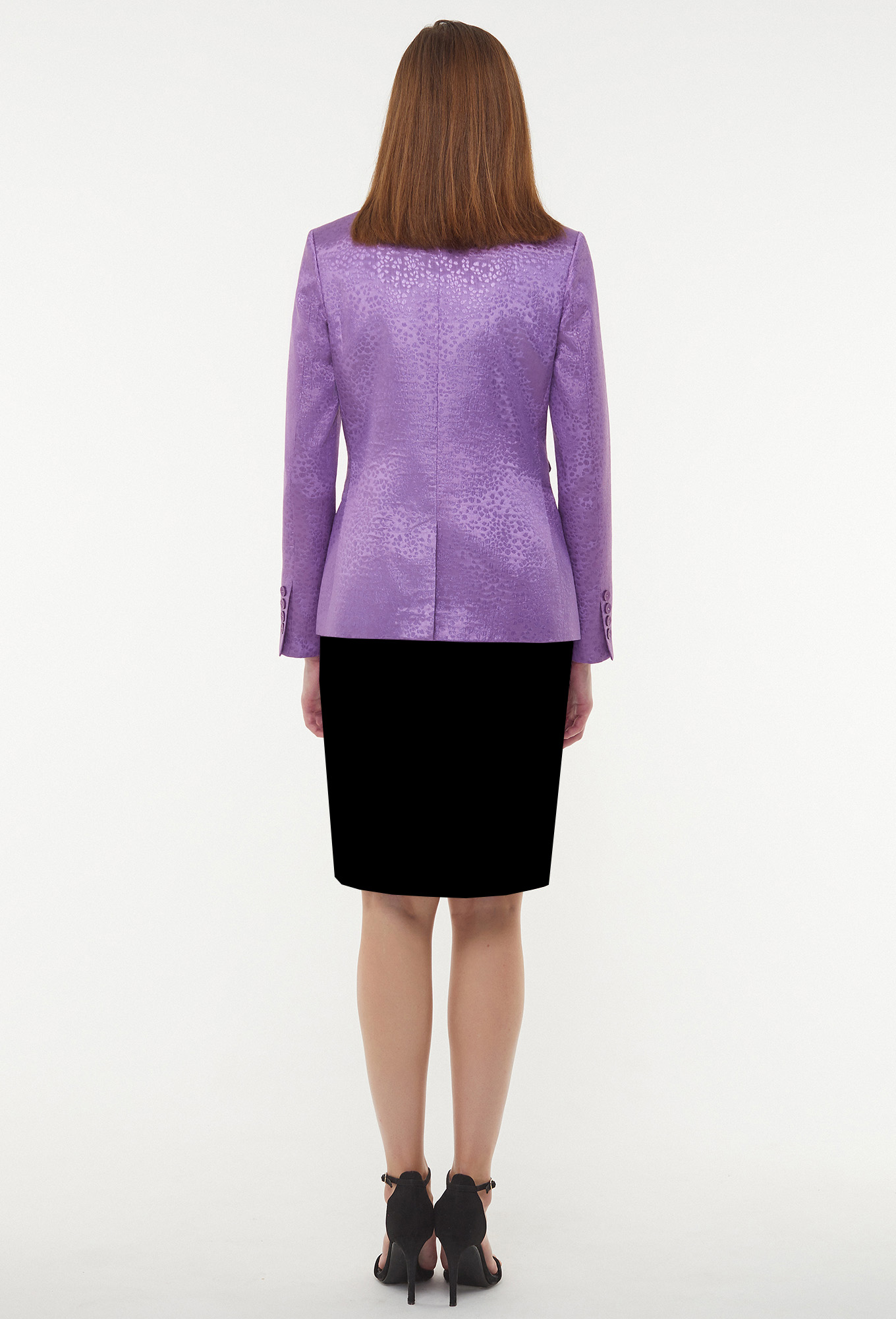 Жакет - стильный однобортный жакет полуприлегающего силуэта выполнен из жакарда с рисунком «гусиная лапка», перед с застежкой на петли и пуговицы, двумя горизонтальными карманами и рамками и одним карманом-обманкой с рамкой и клапаном. Средний шов спинки заканчивается шлицей, рукава втачные двушовные со шлицами и отделочными пуговицами. Воротник отложной с лацканами, на подкладке.