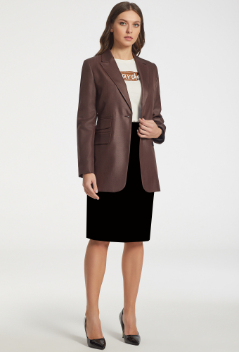 Элегантный однобортный жакет с широкими фигурными лацканами полуприлегающего силуэта выручит в любой ситуации. Перед с V-образным вырезом горловины, с центральной застёжкой на петли и пуговицы, с двумя функциональными карманами с клапанами и фигурной формой борта. Рукава втачные двухшовные с декоративными шлицами с отделочными пуговицами.