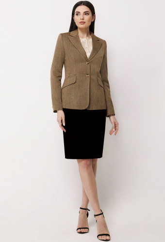 Укороченный жакет полуприлегающего силуэта с отрезной баской и отложным воротником. Перед изделия с центральной застёжкой на петли и декоративные пуговицы и с двумя карманами-обманками, украшенными пуговицами. Рукава втачные двухшовные. На подкладке.