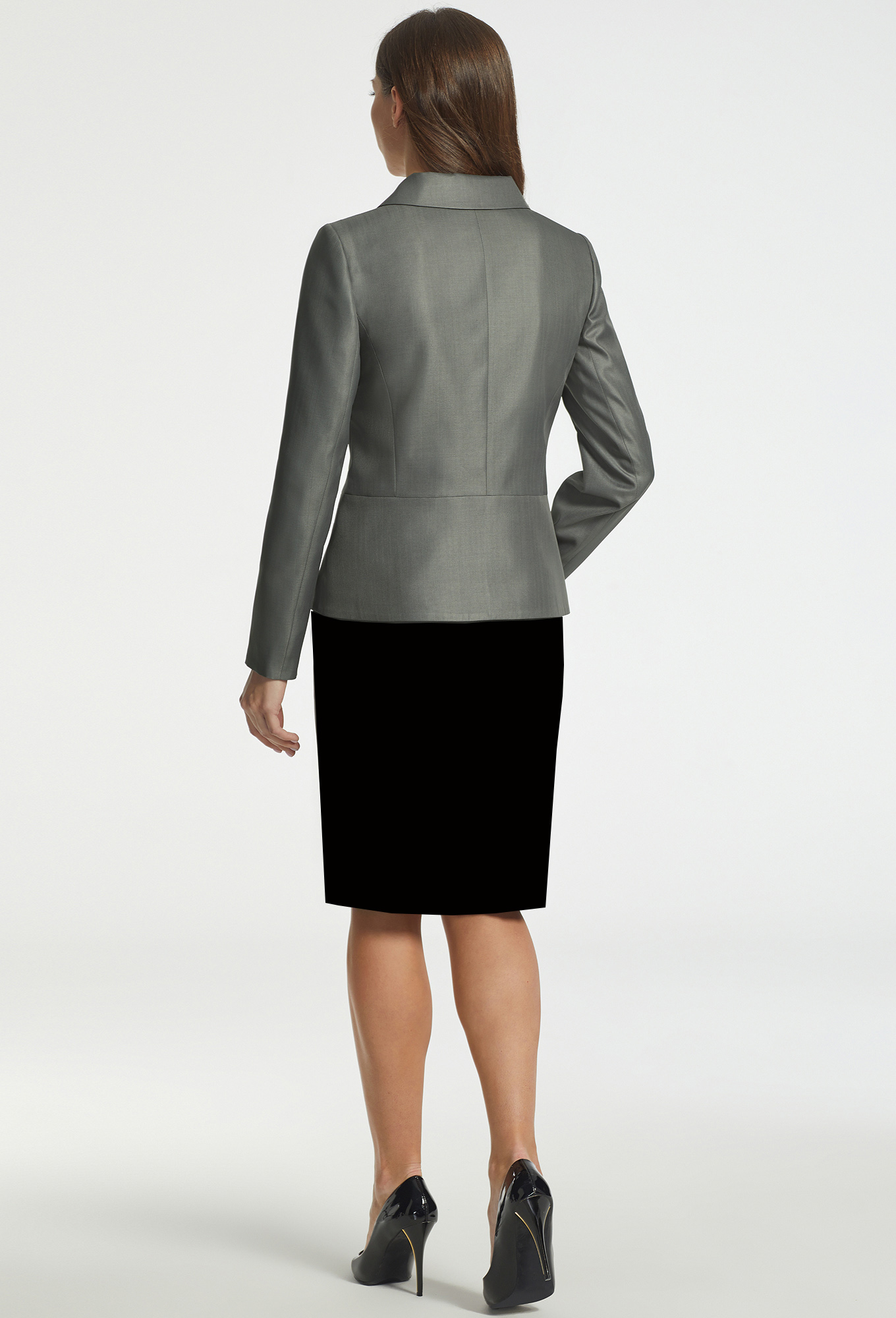 Укороченный жакет полуприлегающего силуэта с отрезной баской и отложным воротником. Перед изделия с центральной застёжкой на петли и декоративные пуговицы и с двумя карманами-обманками, украшенными пуговицами. Рукава втачные двухшовные. На подкладке.