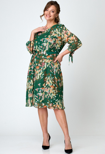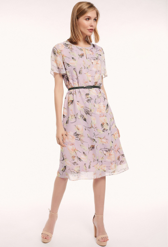 Платье А-образного силуэта, выполнено из принтованного шифона, с округлым вырезом горловины. Перед со средним швом, в котором обработан фигурный вырез и небольшой сборкой по горловине. В среднем шве спинки обработана застежка на навесную петлю и пуговицу. Рукава втачные одношовные, слегка расширены книзу. Талия подчеркивается поясом-ремнем с пряжкой. Ремень может отличаться от студийного фото.