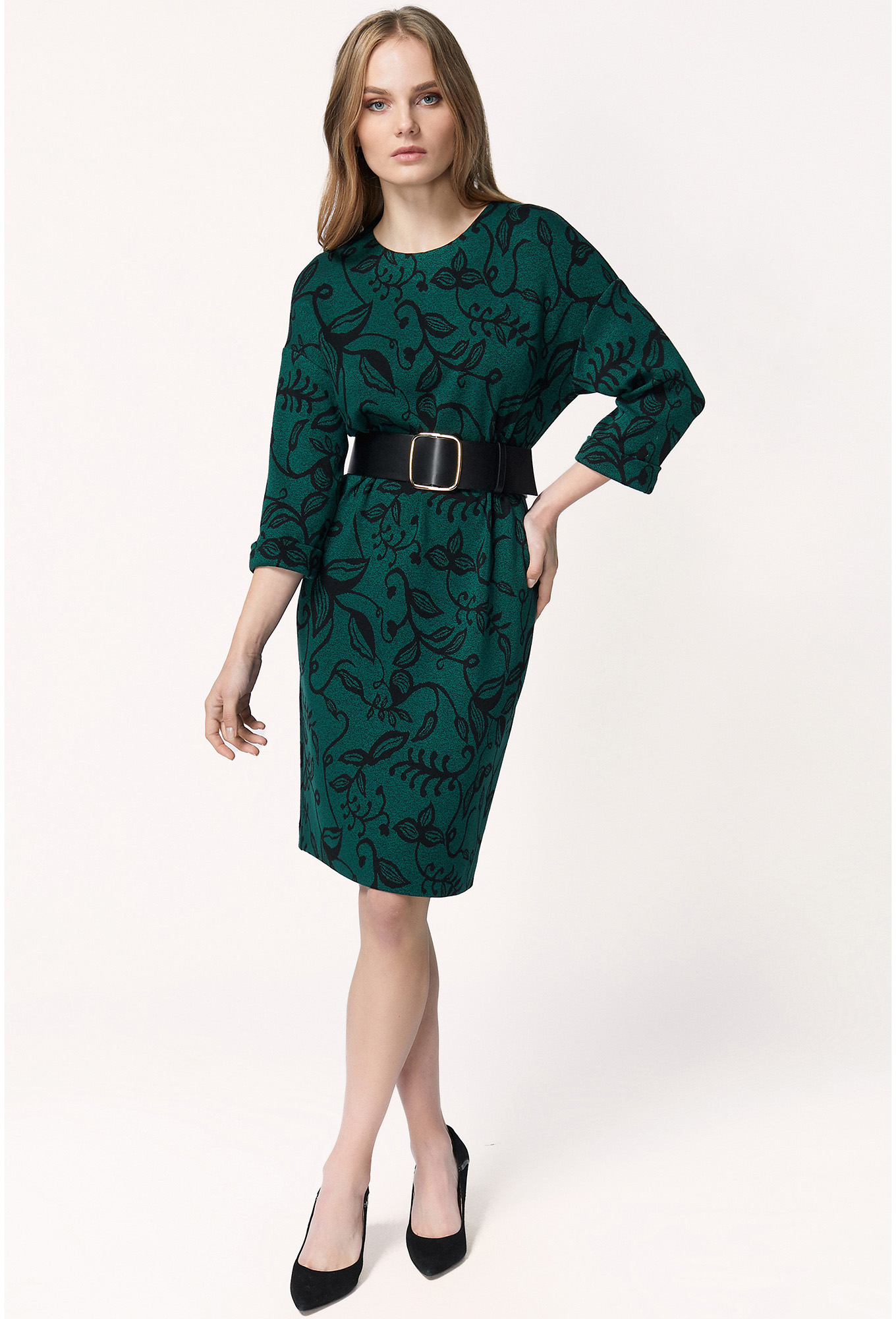 Платье свободного кроя слегка заужено к низу, выполнено из трикотажного полотна с рисунком, с округлой формой горловины, со спущенной линией плеча и притачными одношовными рукавами с манжетами, в среднем шве спинки обработана потайная молния. Платье дополняется поясом-ремнем с пряжкой. Ремень может отличаться от студийного фото.