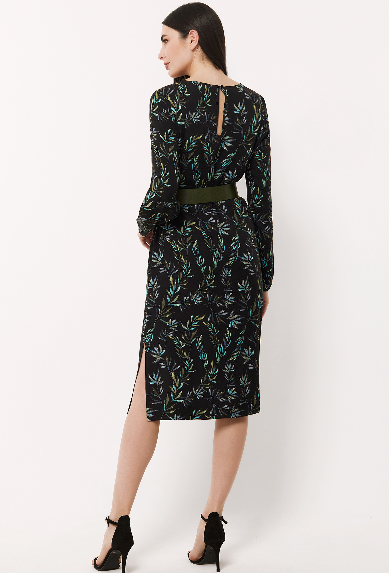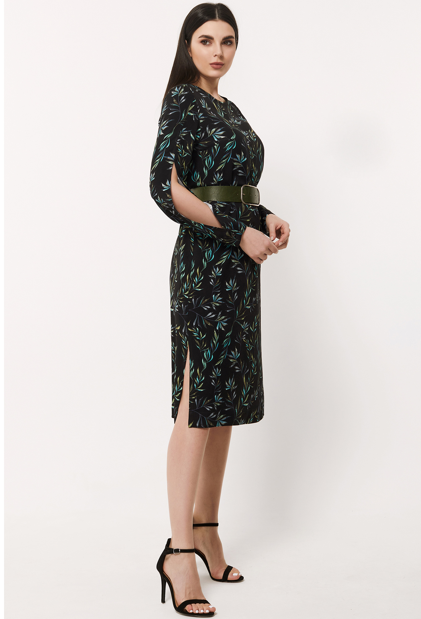 Данная модель миди-платье прямого силуэта – эталон женственного образа. Правильное настроение задали при помощи стильного принта и интересного кроя рукавов с разрезами, частично приоткрывающими руки, и манжетами с отделочными пуговицами. Динамичность модели придают разрезы в боковых швах. По спинке обработана застёжка-капля с навесной петлёй и отделочной пуговицей. Сформировать приталенный силуэт помогает ремень.