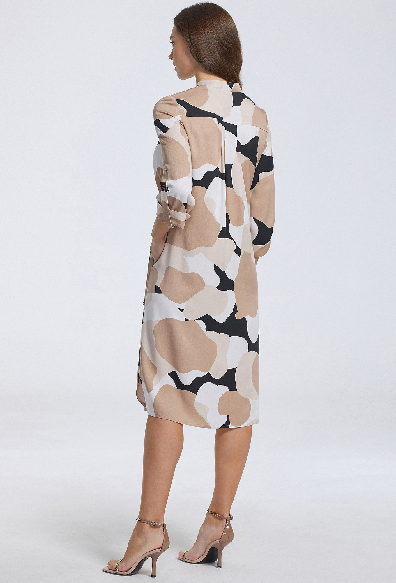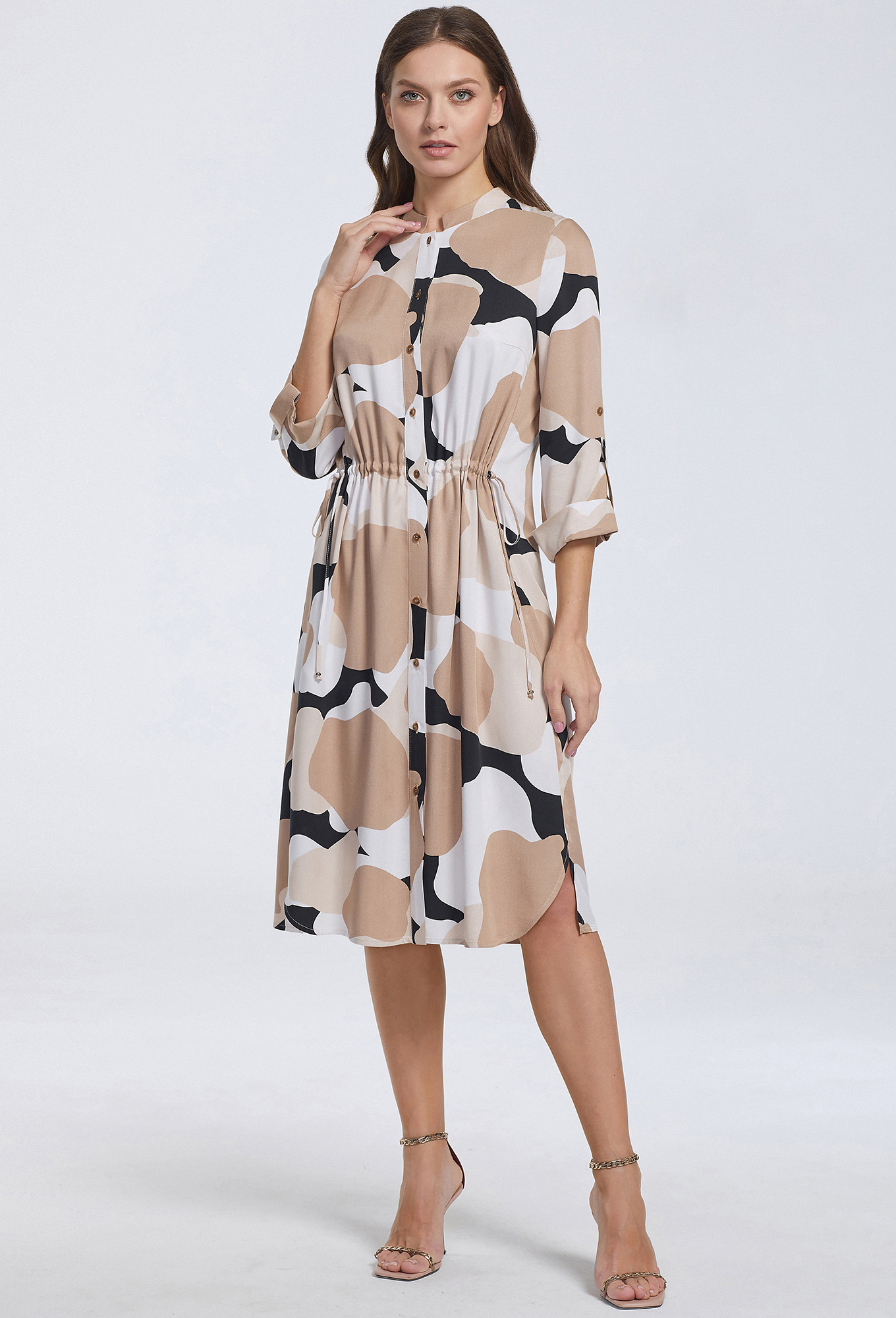 Интересная модель платья-рубашки с фигурной формой низа, привлекает к себе своим необычным кроем и модным, с красивым сочетанием цветов, дизайном. Изделие выполнили из мягкой, приятной к телу итальянской вискозной ткани. Модель свободного кроя, с узким воротником-стойкой, со смещенными на перед боковыми швами, в которых обработаны карманы. Перед с центральной застёжкой на петли и пуговицы и кулисой в области талии, помогающей регулировать силуэт. Спинка с кокеткой и складками. Рукава втачные укороченные с отложными манжетами, патами и отделочными пуговицами.