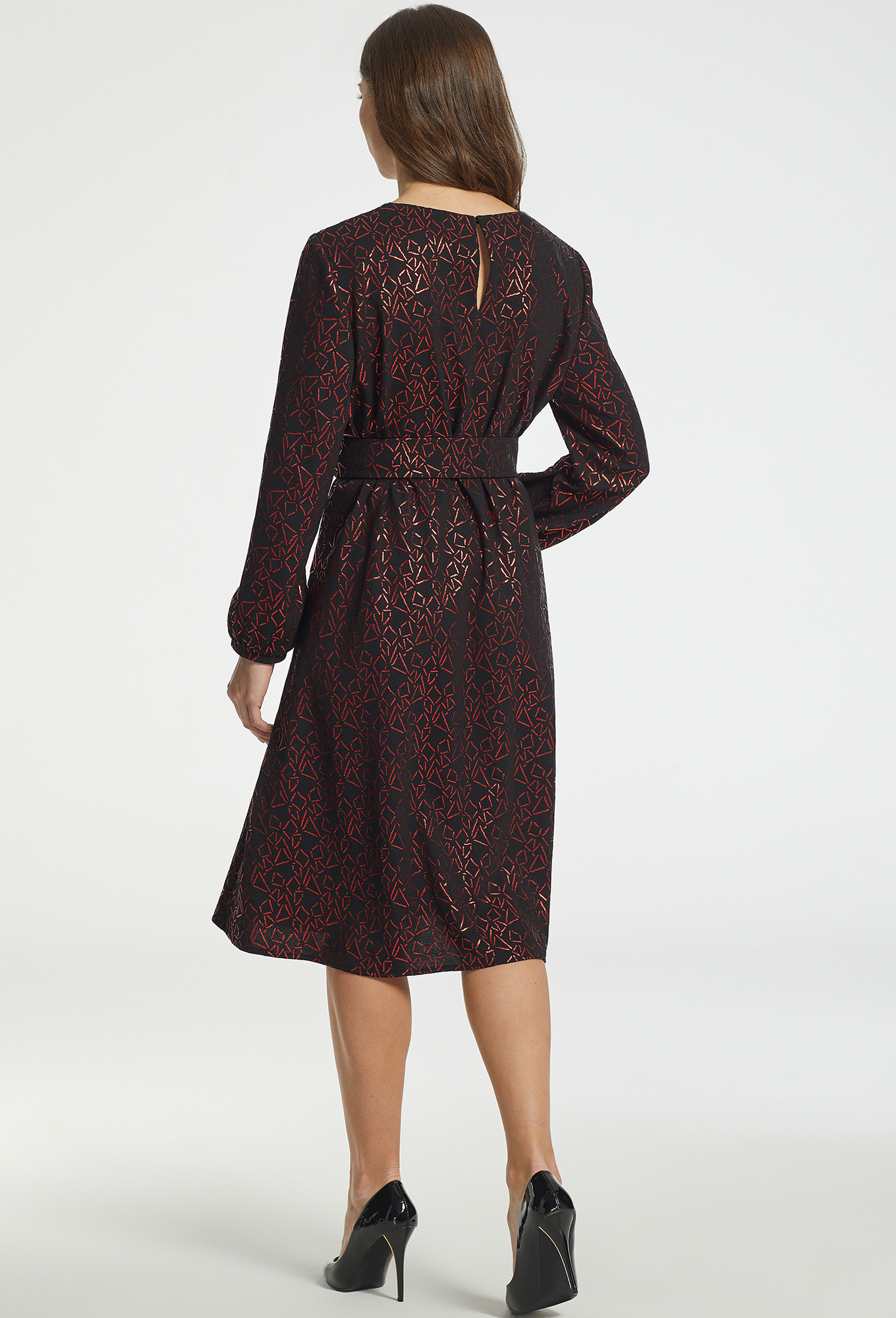 Это платье позволяет чувствовать себя особенной и красивой в любой ситуации и понравится женщинам, которые любят оригинальную элегантность, благодаря характерному контрастному узору. Платье-миди A-образного силуэта украсили сборкой по горловине переда и по низу рукавов. Для удобства в эксплуатации по спинке предусмотрена застёжка-капля на навесную петлю и пуговицу. Дополнительныйм преимуществом является пояс с пряжкой , который подчёркивает талию и придаёт силуэту женственные очертания.