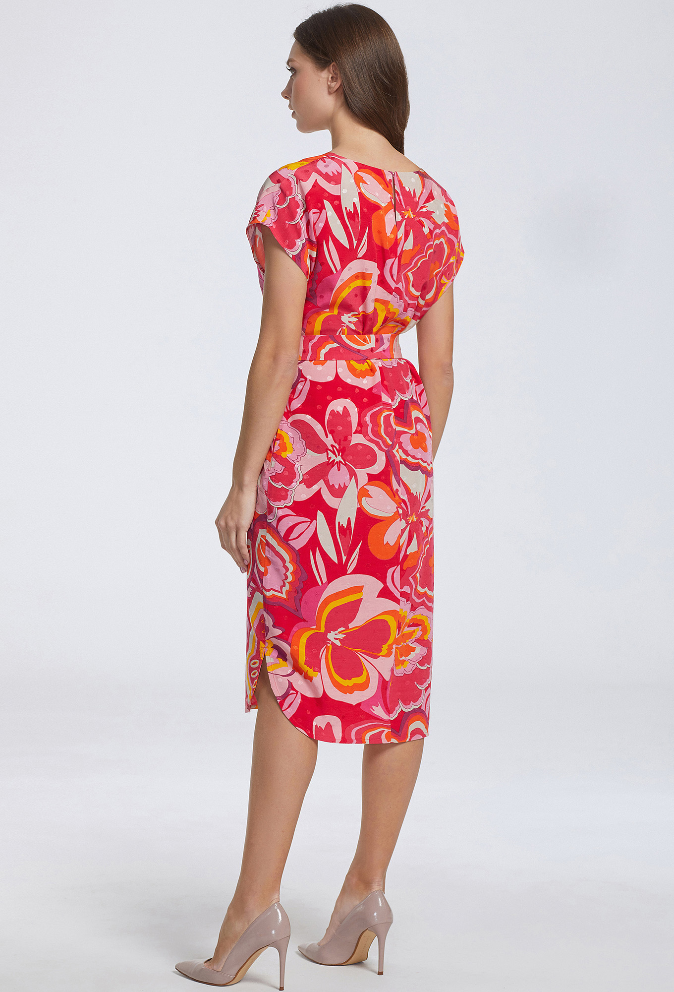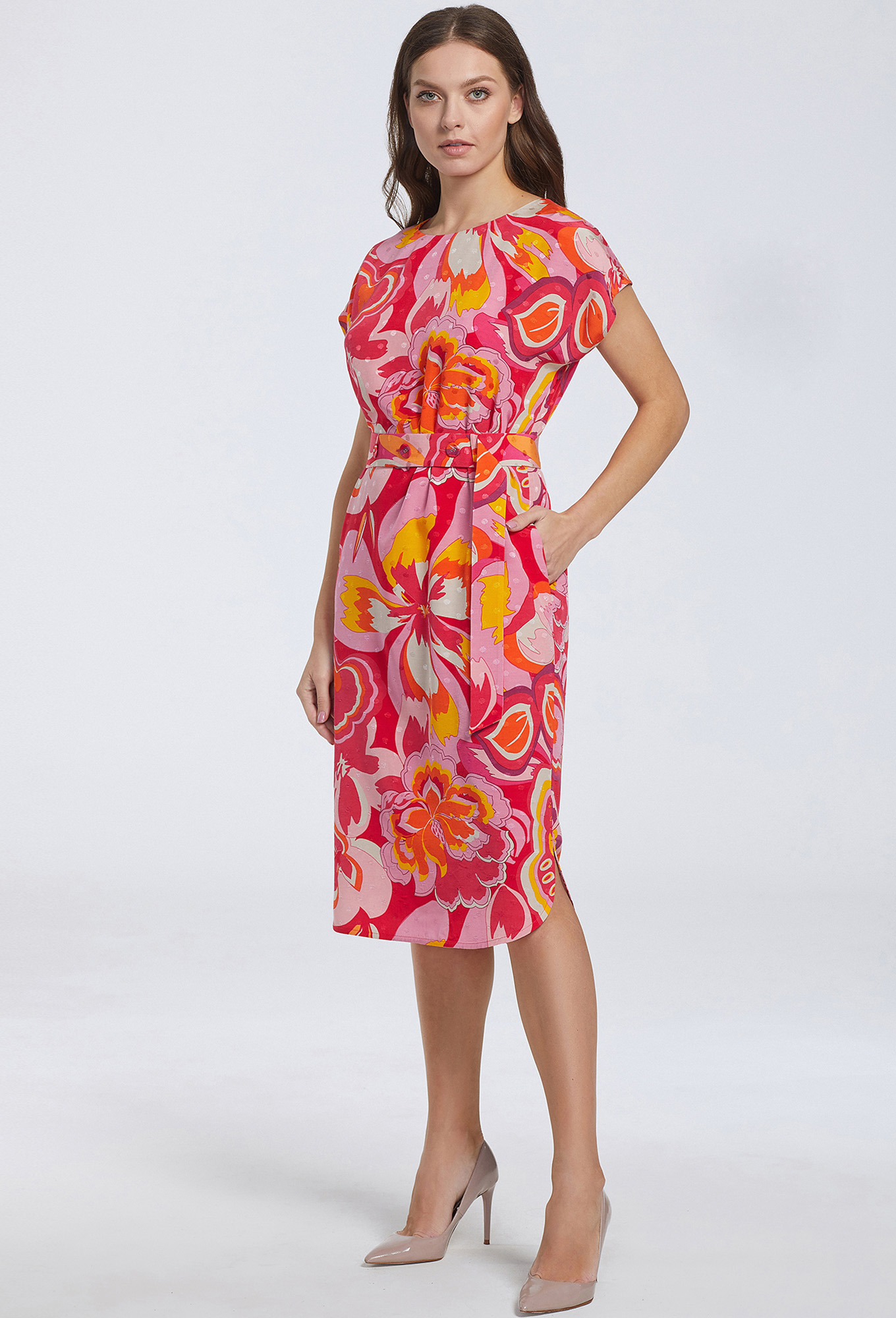 Несмотря на лаконичный крой платья, в нем вы обязательно окажетесь в центре внимания, благодаря красивой испанской ткани с интересным сочетание матовой основы с ярким цветочным принтом и мелким атласным горошком. Модель свободного силуэта с цельнокроенными короткими рукавами, с округлой формой низа. В среднем шве спинки обработана застежка на навесную петлю и пуговицу, а в боковых швах обработаны функциональные карманы. Линия талии красиво подчёркивается интересным поясом с пуговицами из основной ткани.