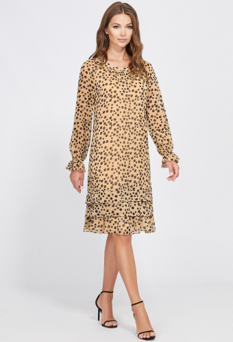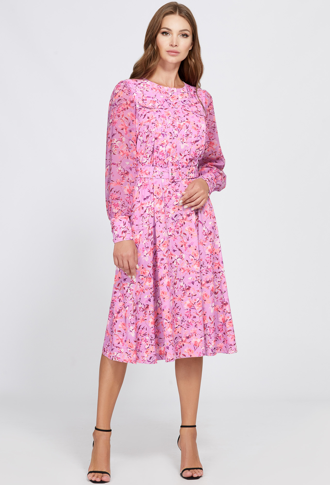 Изящное платье с цветочным мотивом выполнили из мягкой приятной немнущейся ткани. Модель Х-образного силуэта, отрезная по линии талии и собранная на эластичную тесьму, что добавляет удобства и обеспечивает посадку на фигуре. Лиф платья по переду украшен планкой с застёжкой на пуговицы в тон, широкими складками и декоративными клапанами с пуговицами в тон. Лёгкость модели придают полупрозрачные рукава из шифона в тон, сосборенные по низу манжетами из основной ткани с застёжкой на петли-пуговицы. Завершает образ пояс с пряжкой в тон, красиво подчеркивающей талию.