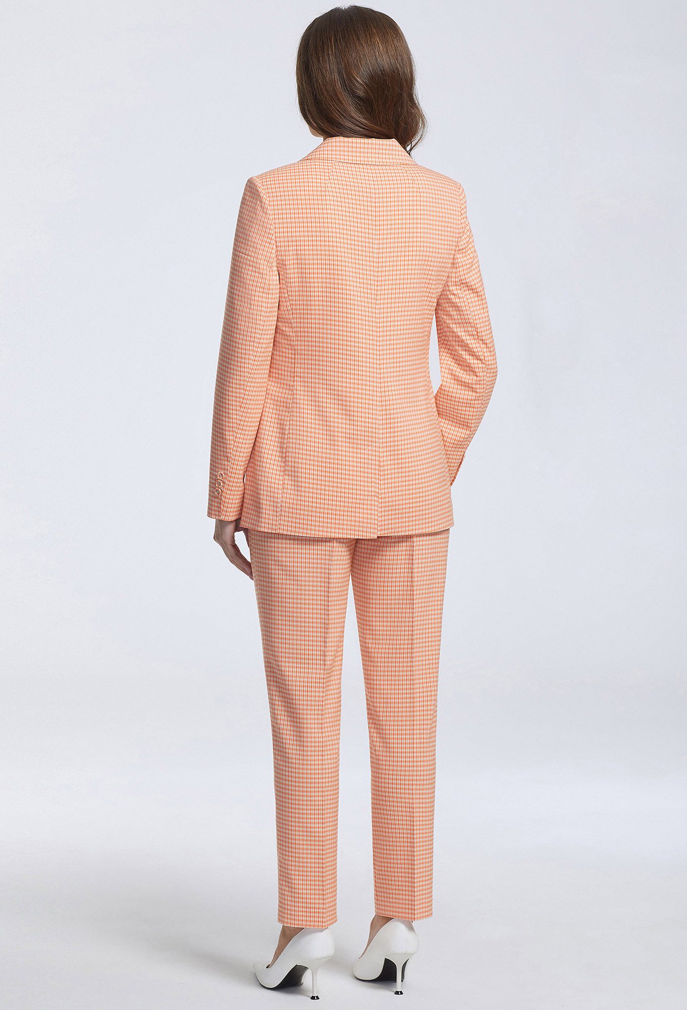 Классический жакет полуприлегающего силуэта с отложным воротником и лацканами будет уместен и в наряде офиса и в повседневном образе. Перед с глубоким вырезом, с застёжкой на петлю-пуговицу и двумя карманами с клапанами и рамками. В среднем шве спинки обработана шлица. Рукава втачные двухшовные со шлицами и отделочными пуговицами. Модель сшили из испанской мягкой приятной ткани с добавлением вискозы. Снизить градус формальности помогает дизайн – стильная яркая клетка с интересным сочетанием мандаринового трендового цвета с классическим бежевым. На подкладке.