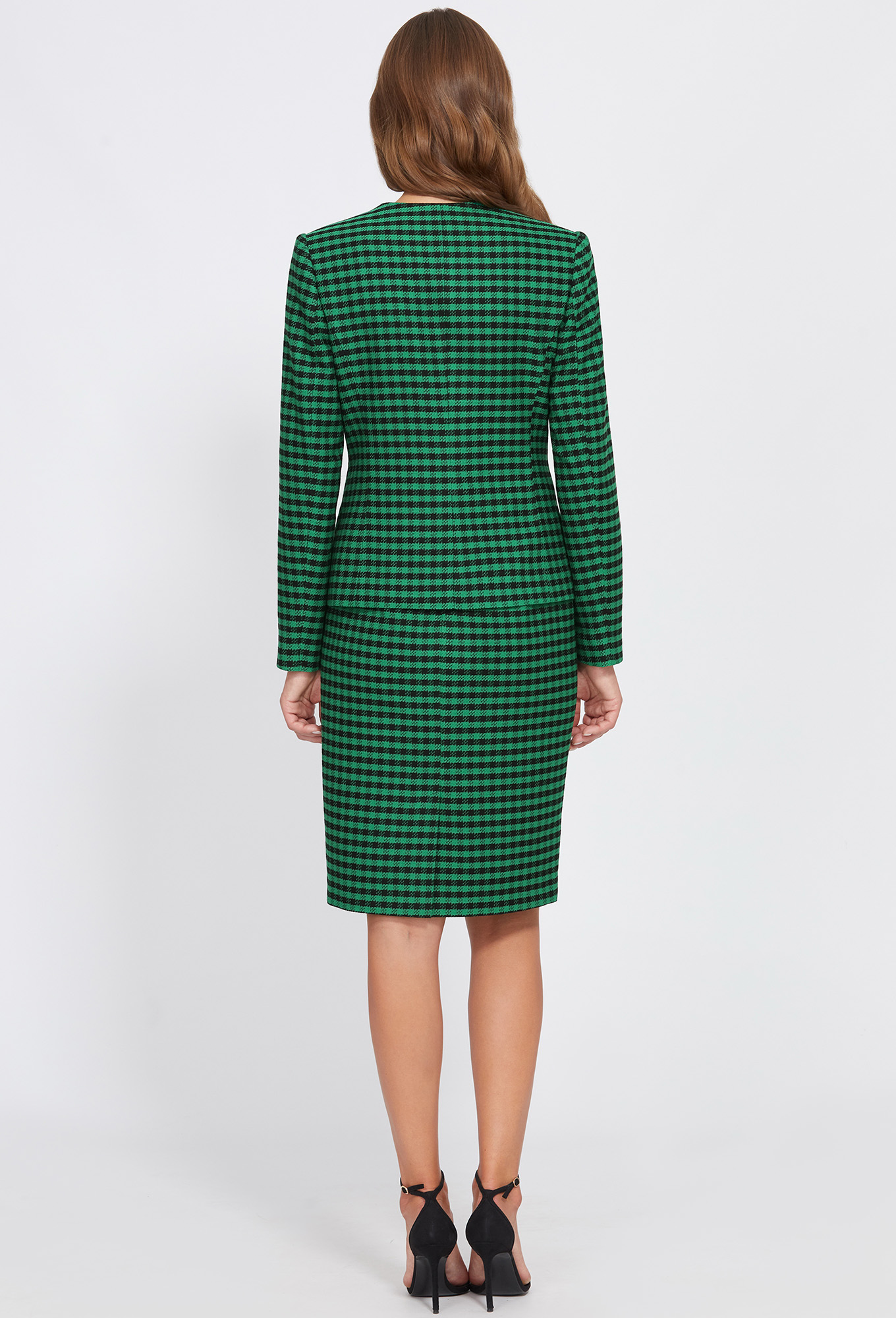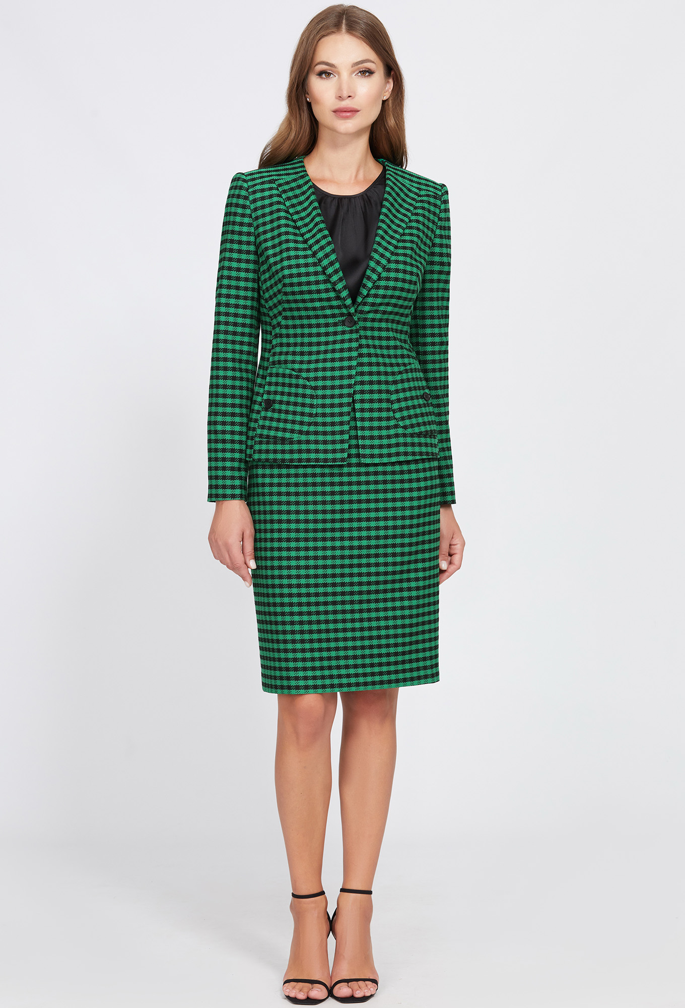 Жакет интересного кроя сшили из итальянской ткани с дизайном «мелкая клетка». Перед с глубоким V-образным вырезом горловины, с центральной застёжкой на петлю и пуговицу, с кокетками и лацканами со втачными концами, косыми вытачками и фигурными накладными карманами с отделочными пуговицами. Рукава втачные двухшовные. На подкладке.