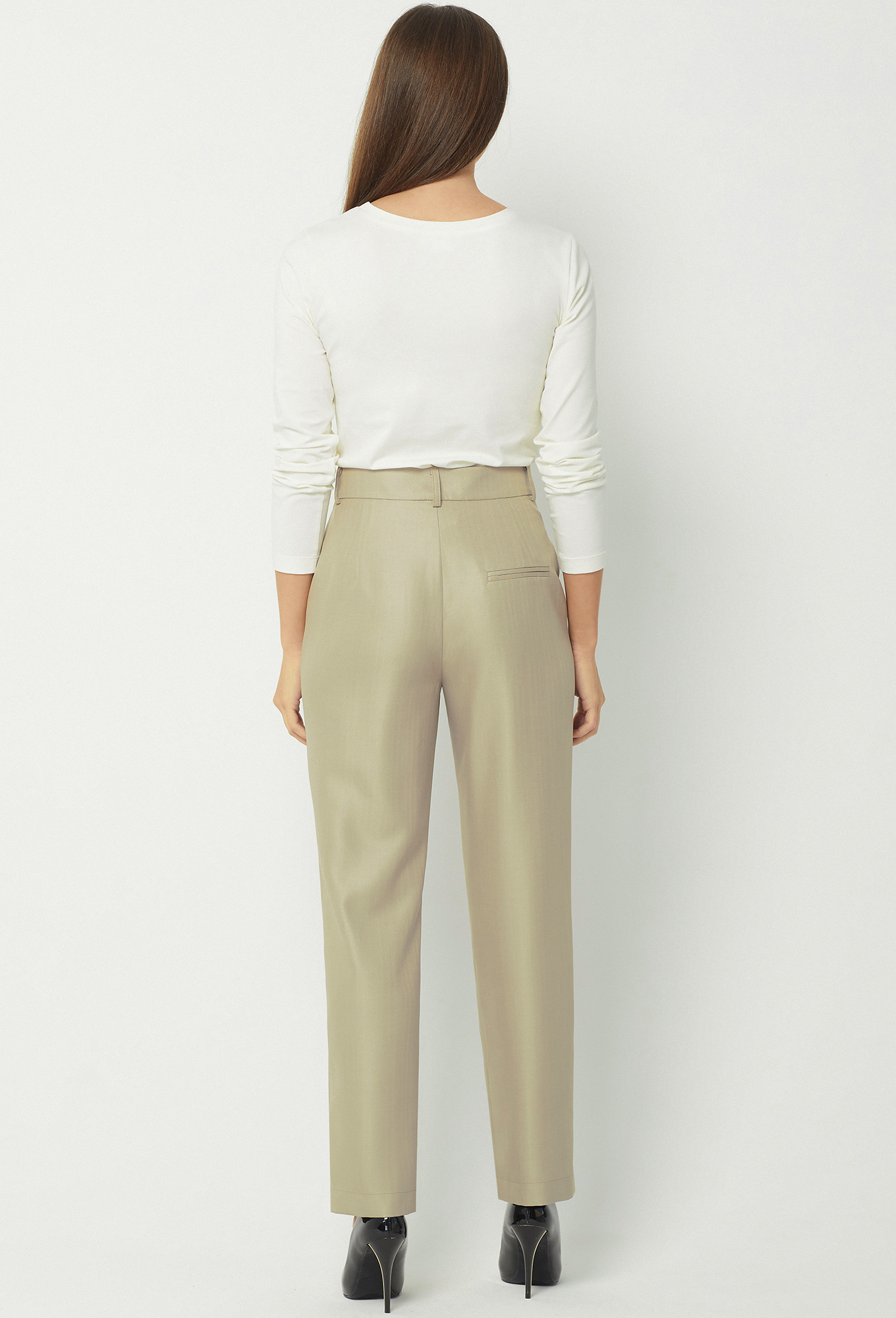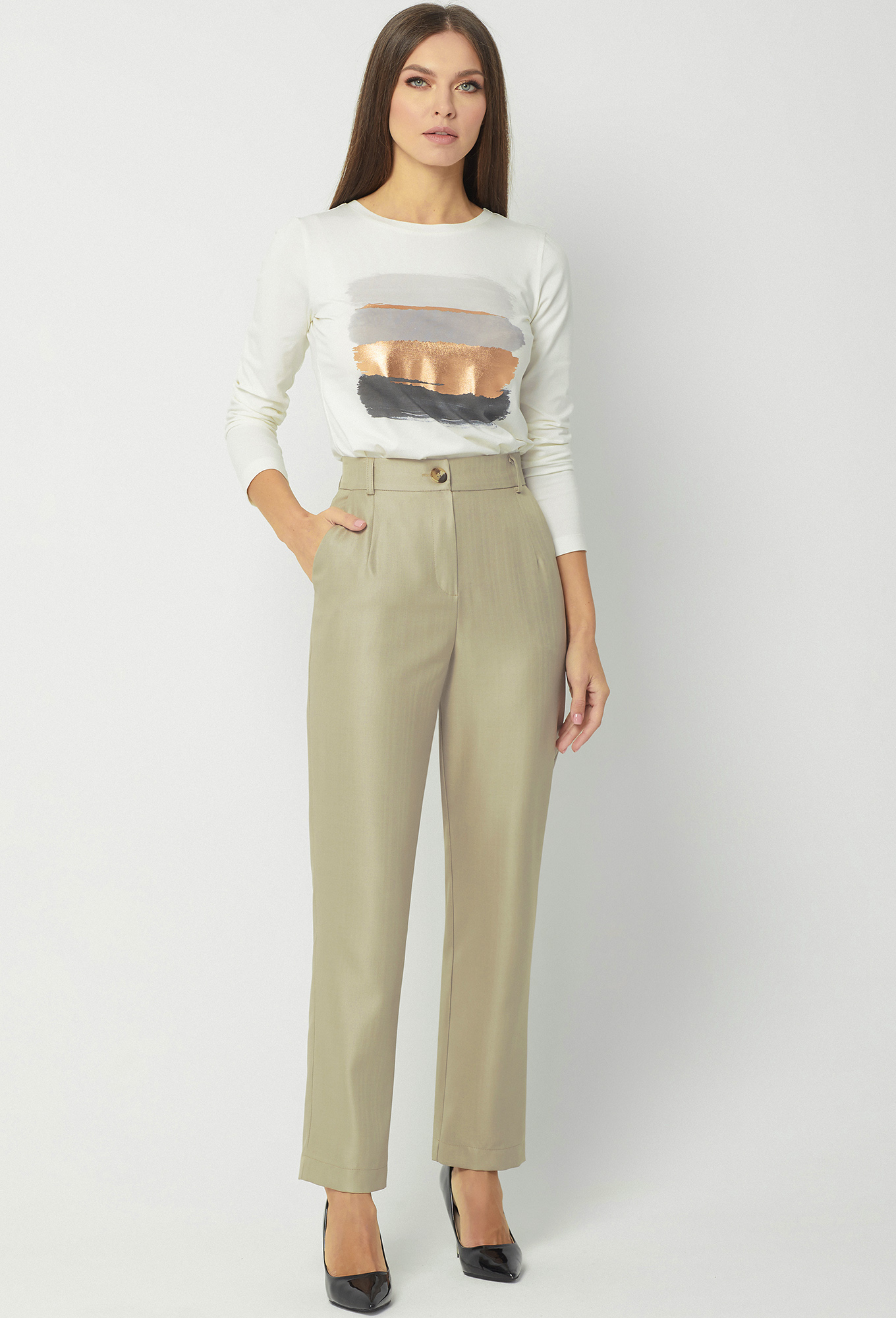 Брюки на притачном поясе со шлёвками, с застёжкой на молнию и две петли-пуговицы. Передние части с косыми карманами. Задняя правая часть с карманом-обманкой с рамками.