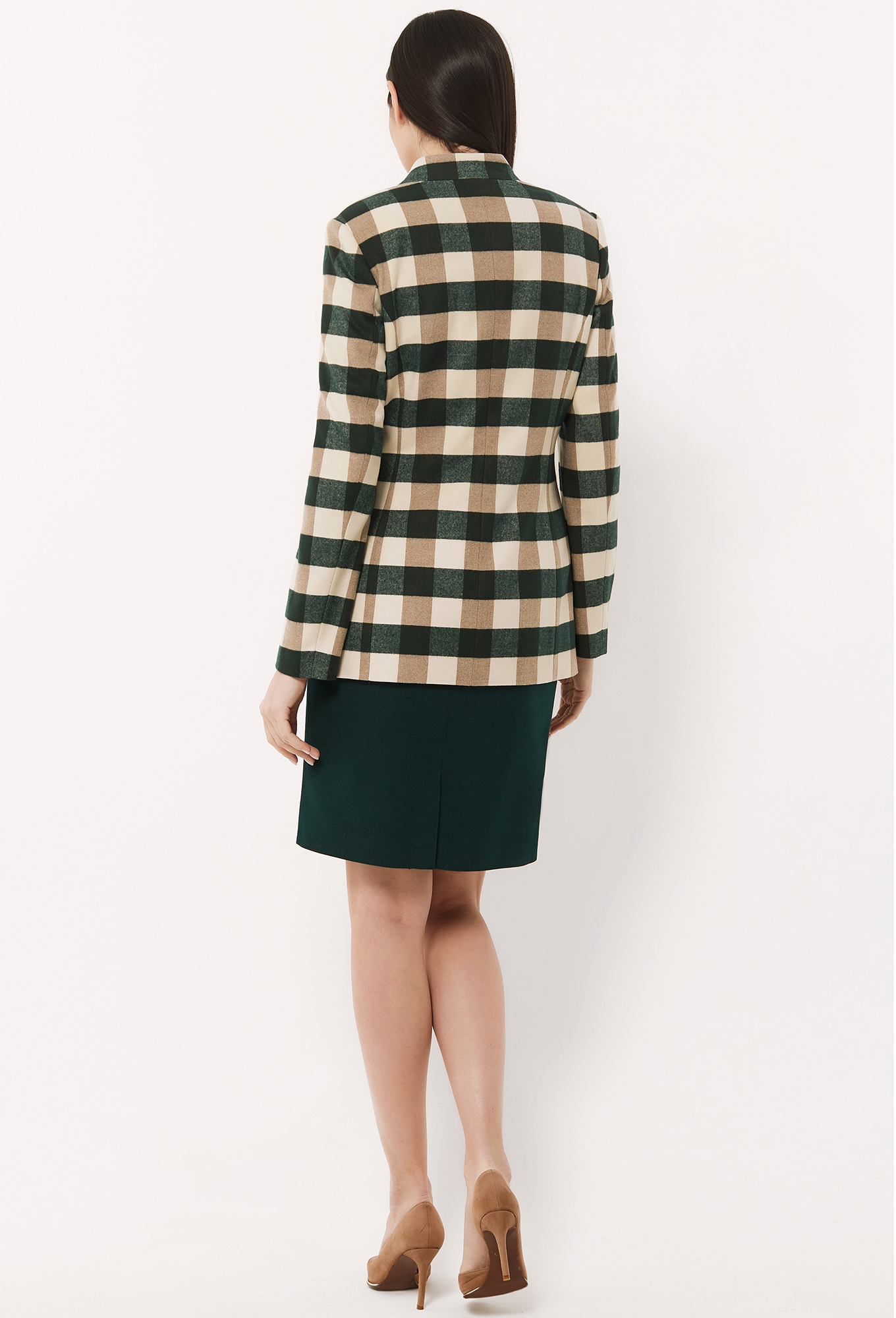 Удобный однобортный жакет полуприлегающего силуэта выполнен из мягкой, приятной на ощупь испанской ткани с добавлением вискозы с ярко-выраженным клетчатым рисунком. Модель станет удачным вложением в гардероб: днём она будет уместно смотреться в офисе, а вечером в ней можно отправиться на светское мероприятие. Перед с фигурным вырезом горловины, с застёжкой на петли-пуговицы и двумя функциональными карманами с рамками. Рукава втачные двушовные. Воротник-стойка. На подкладке.