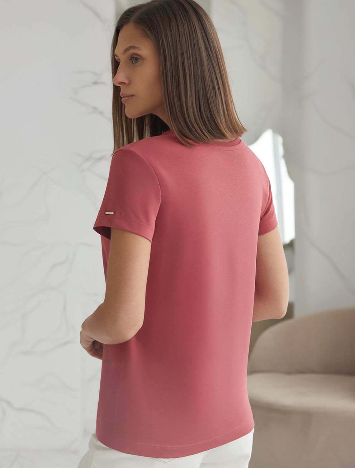 Стильная и модная женская футболка темно-кораллового цвета станет отличным дополнением к вашему гардеробу. Футболка плотностью 170 Г/м2 изготовлена из премиального хлопка с добавлением эластана. Добавление эластана в состав изделия способствует формоустойчивости. Эта классическая футболка подходит для создания кэжуал образа на каждый день и идеально подойдет для работы. Модель не мнется, что делает ее практичным вариантом для активных женщин, которые ценят стиль и удобство. Благодаря однотонной расцветке эта футболка легко комбинируется с различными элементами гардероба. Она станет универсальным решением для тех, кто предпочитает комфортный стиль casual. Повседневная футболка подчеркнет вашу индивидуальность и позволит вам выглядеть привлекательно в любой ситуации. Легкость в уходе и высокая износостойкость делают ее незаменимой вещью в вашем гардеробе. Одевайте эту модель как на работу, так и на встречу с друзьями — она всегда будет уместна! Стильная и практичная модель с простым кроем и лаконичным дизайном - идеальный вариант для тех, кто ценит качество, минимализм и классический стиль в одежде.