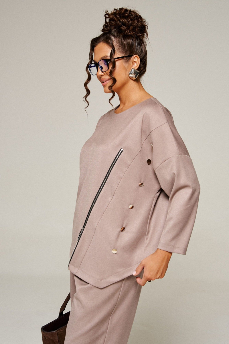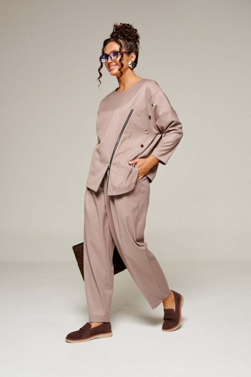 Костюм состоит из 2-х предметов одежды: блузона и брюк. Выполнен из костюмной ткани, мягкой и приятной на ощупь, актуальной расцветки.