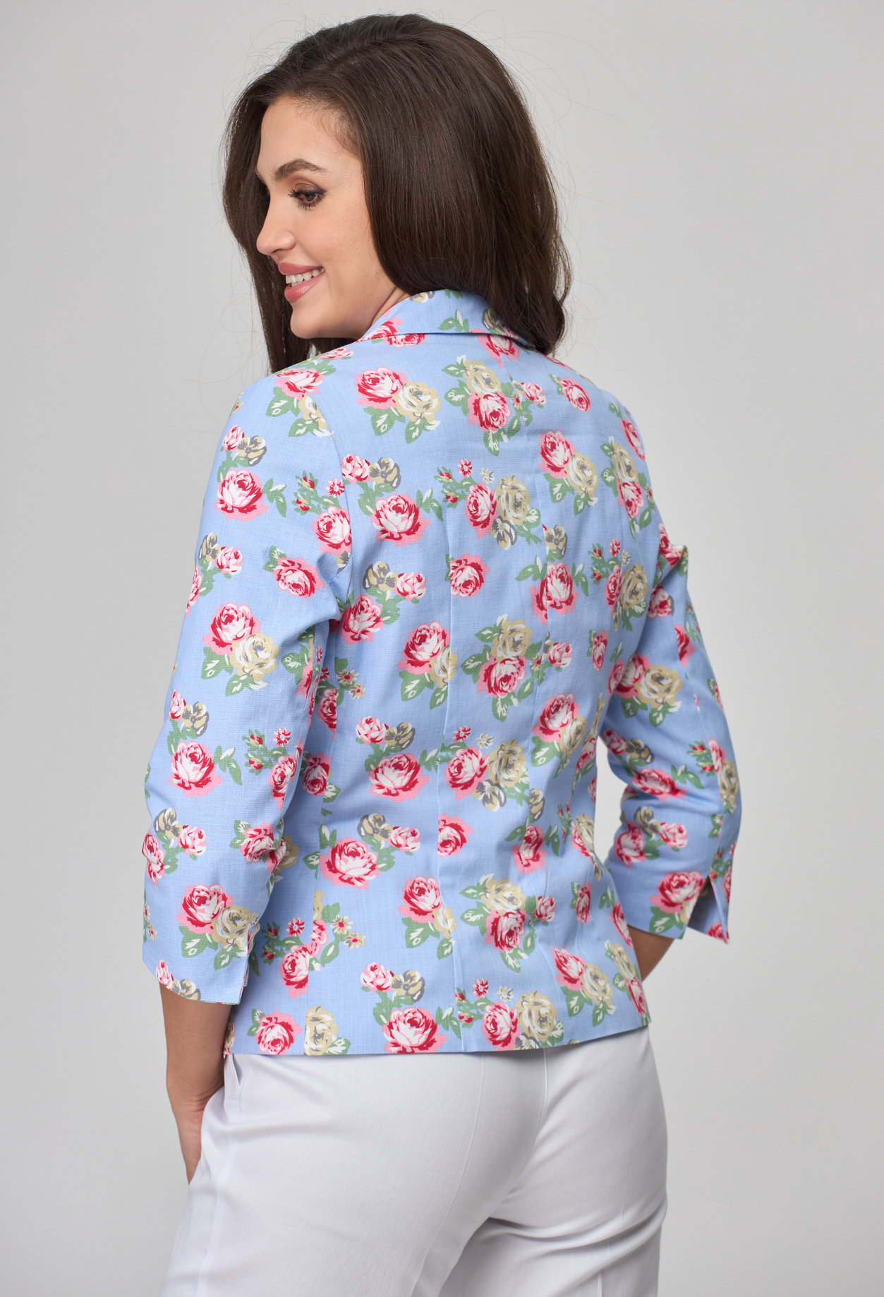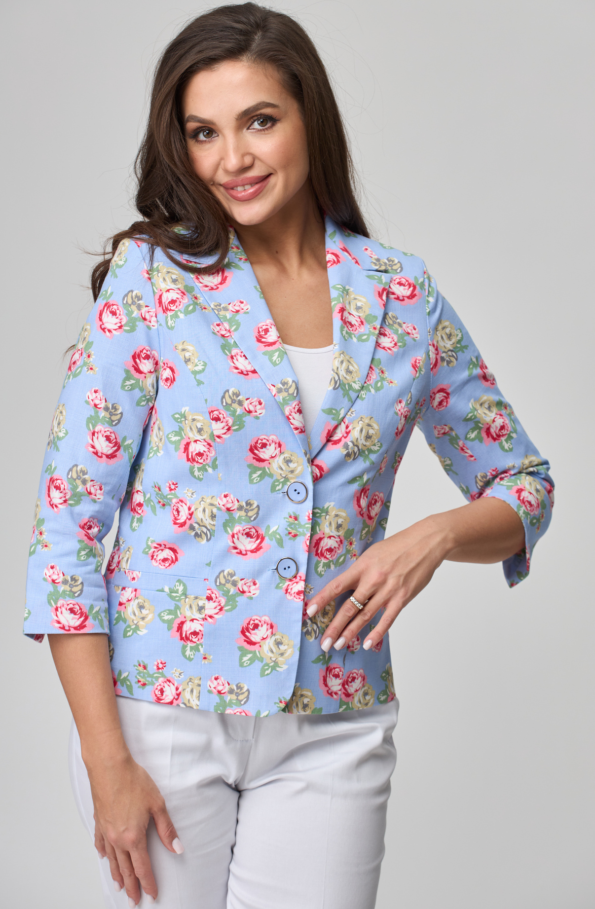 Жакет женский укороченный, полуприлегающего силуэта с центральной бортовой застежкой на пуговицы до линии перегиба лацкана. Спереди рельефные швы от плечевого шва,отрезной бочок и прорезной карман с листочкой. Спинка со средним швом и рельефами от плечевого шва. Рукав втачной, двухшовный, 3/4. Воротник пиджачного типа. Жакет на х/б подкладке. Фурнитура может отличаться от студийного фото.