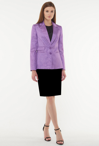 Жакет женский укороченный, полуприлегающего силуэта с центральной бортовой застежкой на пуговицы до линии перегиба лацкана. Спереди рельефные швы от плечевого шва,отрезной бочок и прорезной карман с клапаном. Спинка со средним швом и рельефами от плечевого шва. Рукав втачной, двухшовный, в локтевом шве по низу небольшой разрез. Воротник пиджачного типа. Жакет по передней части на х/б подкладке. Фурнитура может отличаться от студийного фото.