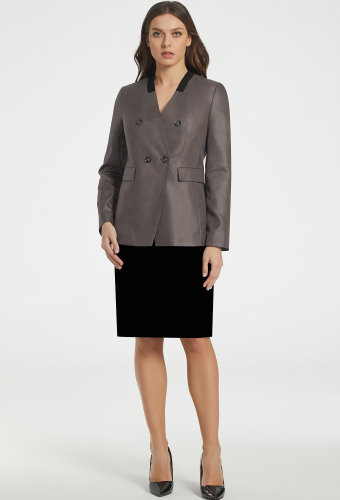 Жакет женский укороченный, полуприлегающего силуэта с центральной бортовой застежкой на пуговицы до линии перегиба лацкана. Спереди рельефные швы от плечевого шва,отрезной бочок и прорезной карман с листочкой. Спинка со средним швом и талиевыми вытачками. Рукав втачной, двухшовный, 3/4. Воротник пиджачного типа. Жакет на х/б подкладке. Фурнитура может отличаться от студийного фото.