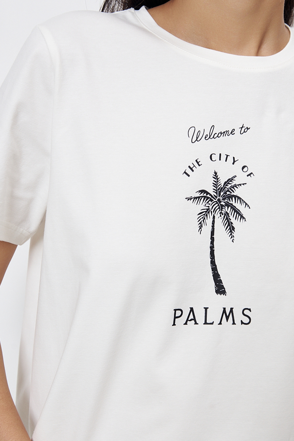 Джемпер из хлопкового эластичного полотна свободного силуэта. Втачной короткий рукав. Круглый вырез горловины оформлен бейкой. На передней части изделия нанесён принт методом шелкографии.