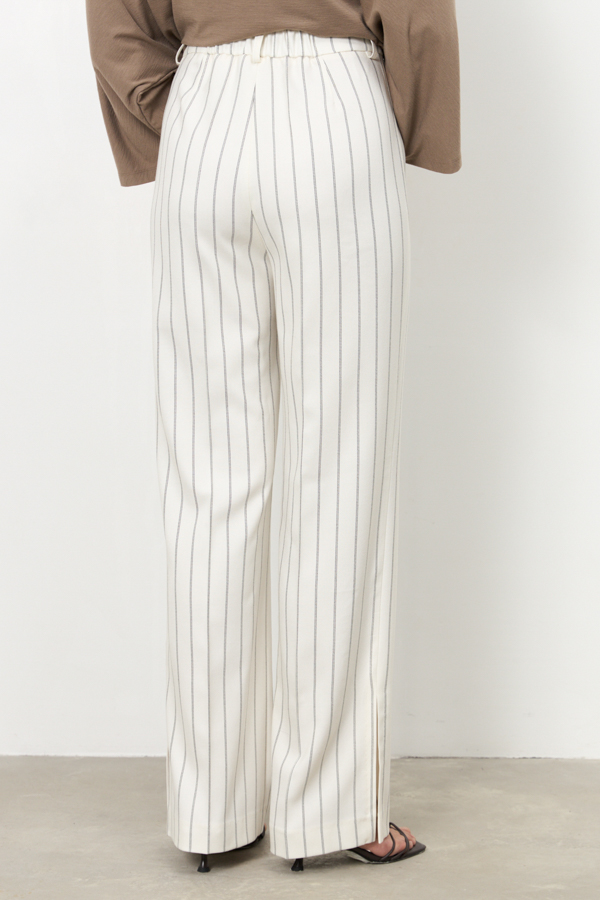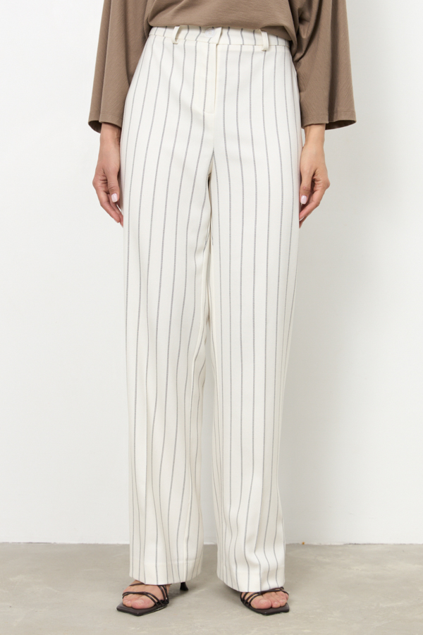 Брюки из костюмной ткани прямого силуэта с разрезами в боковых швах. Застёжка на молнию-гульфик и пуговицу. Притачной пояс со шлёвками. На поясе задней половинке брюк вставка с резиной. Секрет такой модели кроется в безупречно точной посадке по талии и бедрам – ничего лишнего, только конструктивные детали, которые придают четкость линиям силуэта.