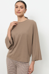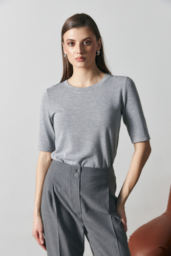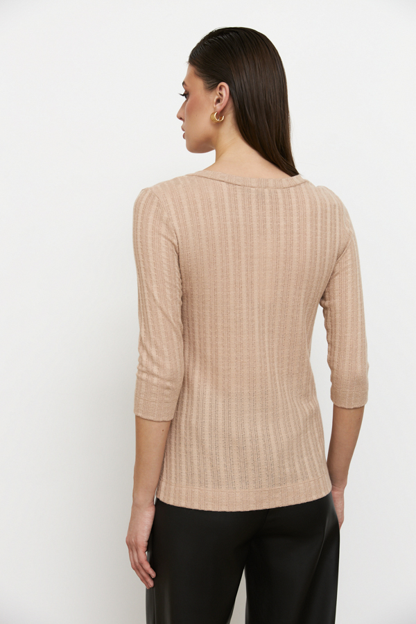 Джемпер прилегающего силуэта из фактурного эластичного полотна. Втачной рукав 3/4. Круглый вырез горловины оформлен бейкой.