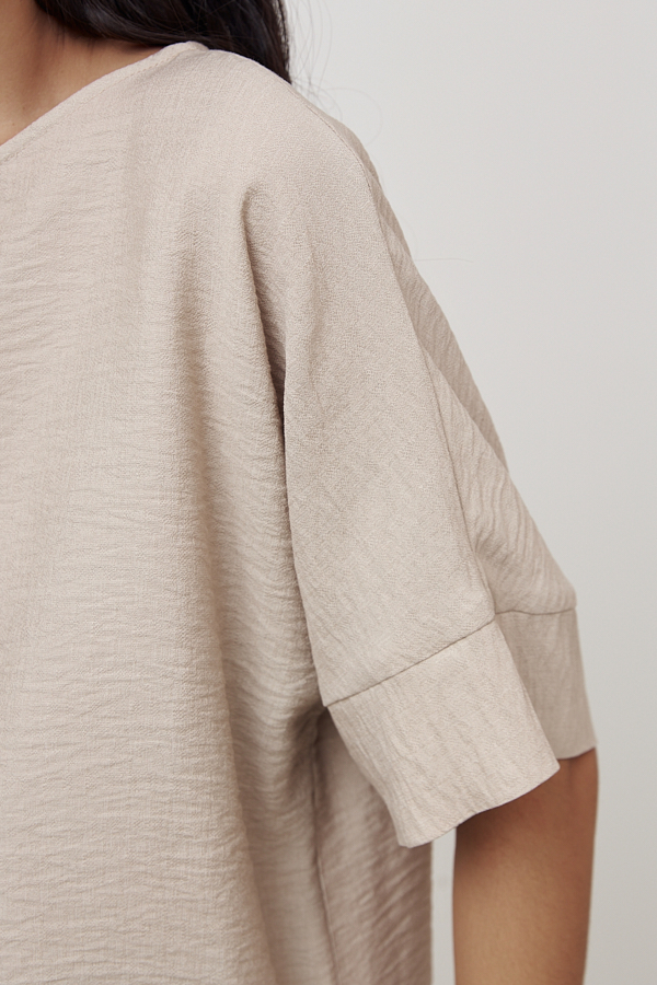 Блуза из вискозной ткани с крэш-эффектом. Очень свободный силуэт с небольшими разрезами по бокам. Круглый вырез горловины. Цельнокроеный рукав с притачной манжетой. Низ изделия затягивается на кулиску.