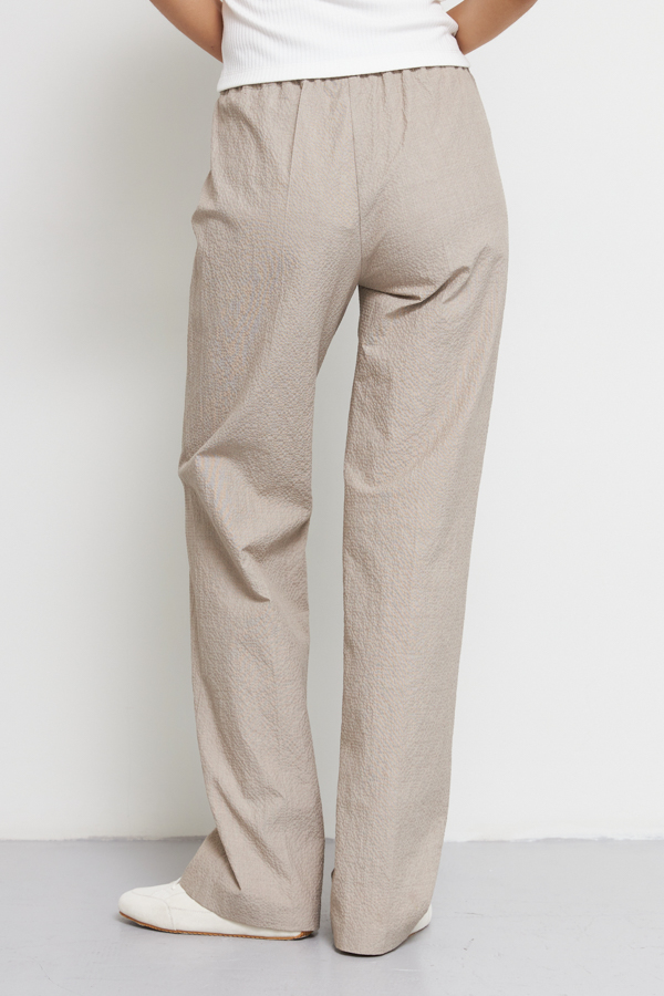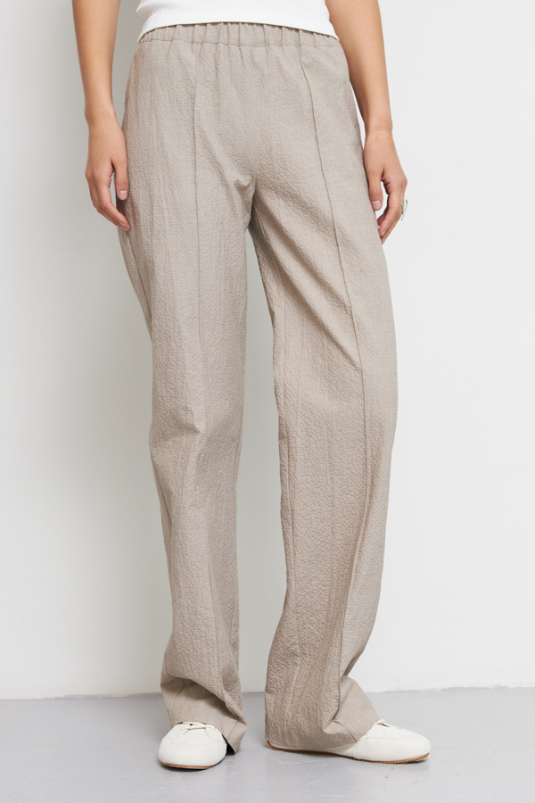 Брюки из фактурной хлопковой ткани прямого силуэта. Пояс притачной с эластичной резиной. На передней части брюк застрочены стрелки.