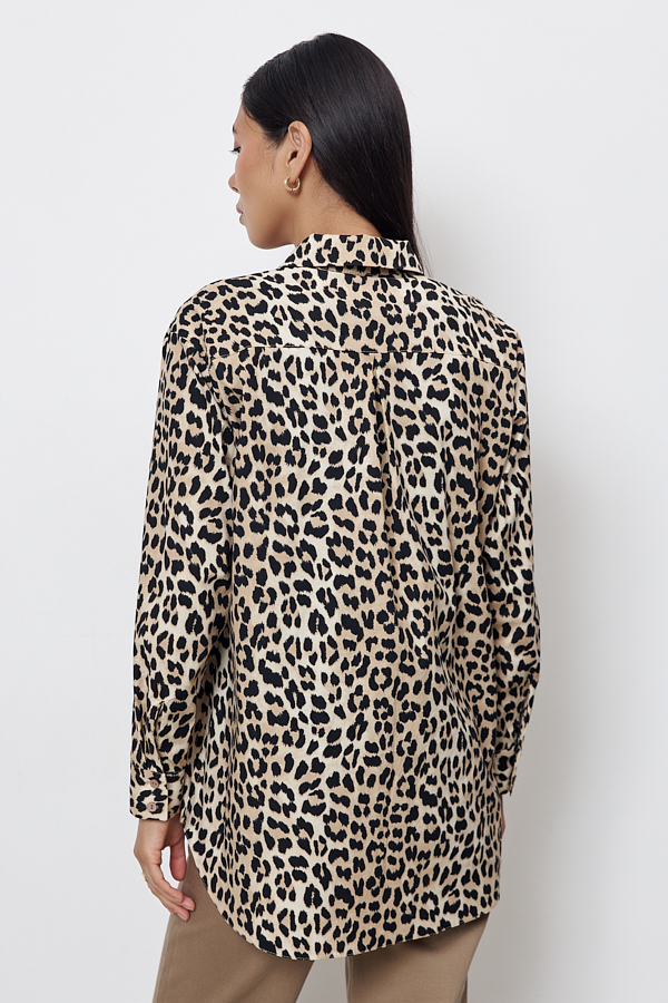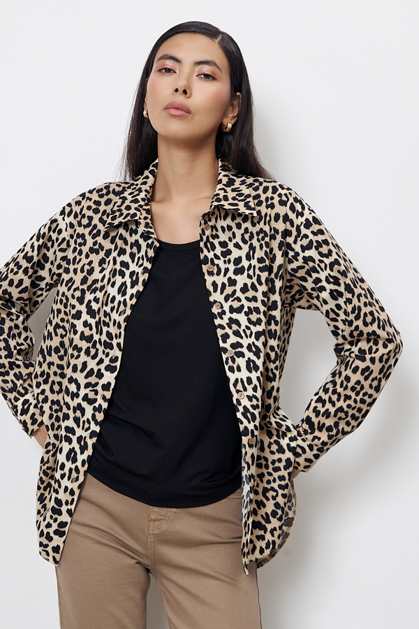 Рубашка из хлопковой ткани свободного силуэта с застёжкой на пуговицы. Низ изделия асимметричной длины (спинка удлинена относительно переда) с закруглениями по бокам. Вырез горловины обработан отложным воротником на стойке. Рубашечный рукав на манжете с застёжкой на пуговицы. На задней части изделия выполнена кокетка с небольшой складкой. Достоинство этой модели - в способности скрыть некоторые недостатки фигуры. Её можно сочетать как с брюками, так и с джинсами.