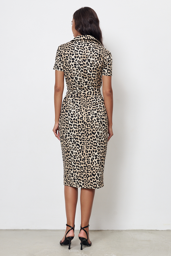 Платье приталенного силуэта из хлопковой плательной ткани. Изделие отрезное по линии талии с защипами. В боковых швах карманы. Втачной короткий рукав. Притачная планка с застёжкой на пуговицы. Вырез горловины обработан отложным воротником на стойке. В комплекте пояс из основной ткани.