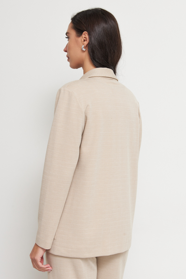Костюм из эластичного полотна. Брюки прямого силуэта. Пояс с эластичной резиной. На передней части брюк застрочены стрелки. Жакет прямого свободного кроя с женственным шалевым воротником. На передней части изделия застежка на пуговицу и накладные карманы. Втачной рукав. Изделие с плечевыми накладками, которые при желании можно убрать.