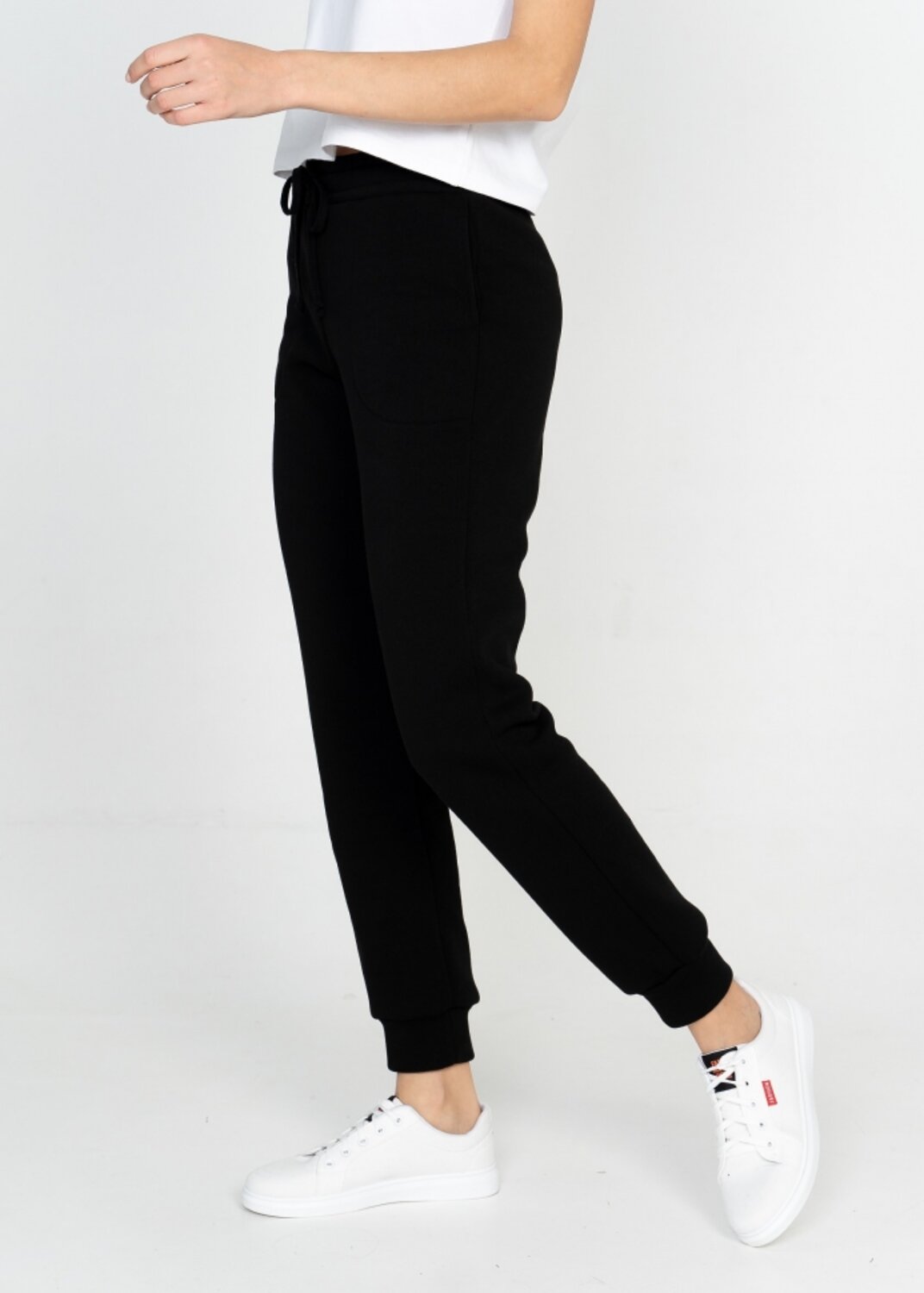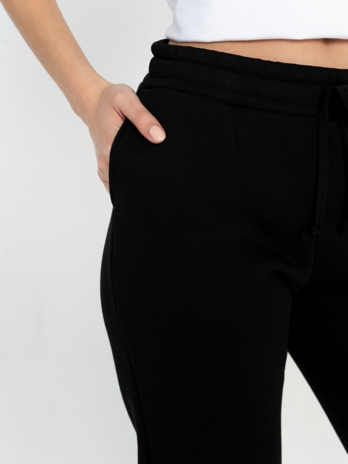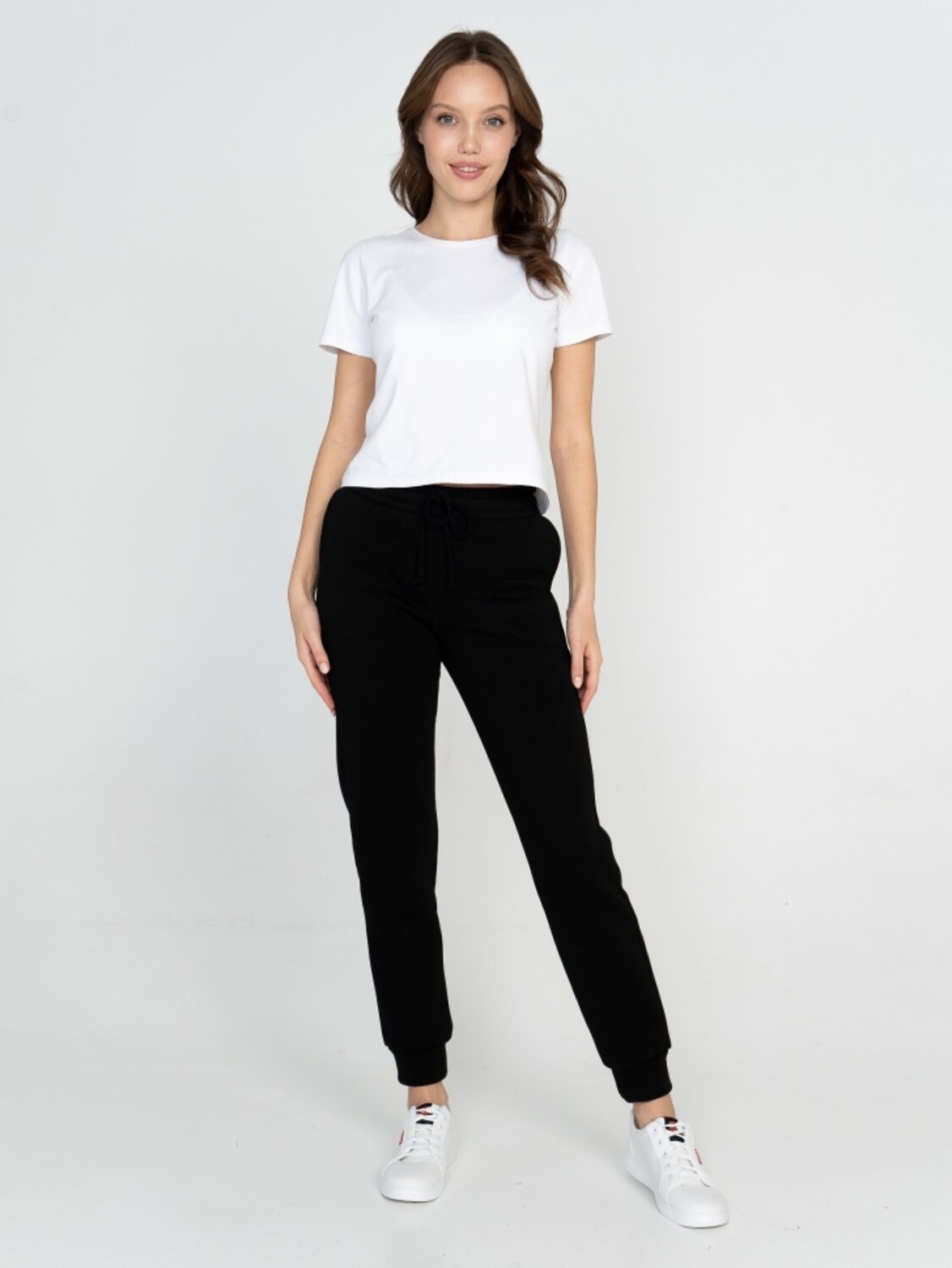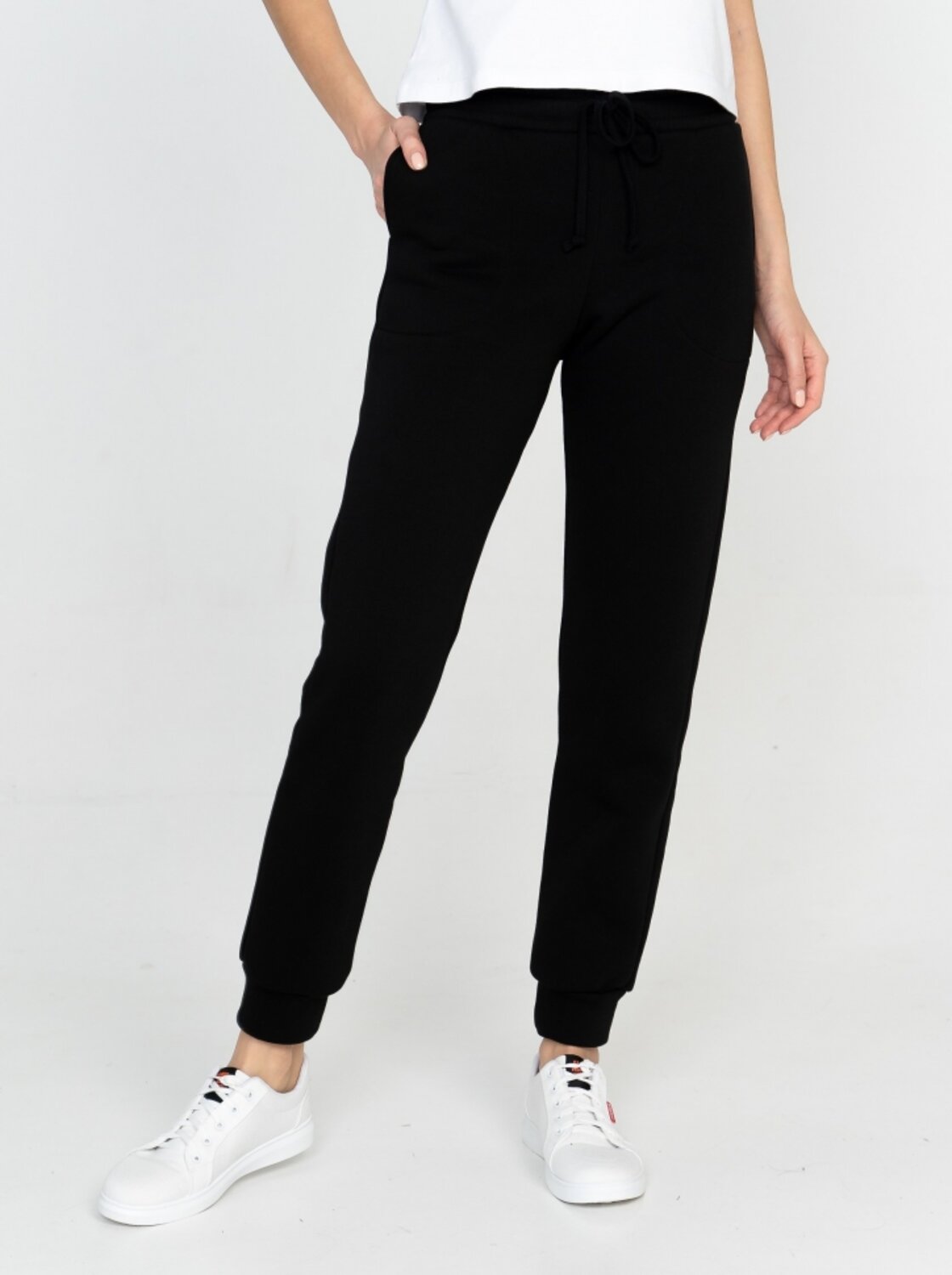 Женские спортивные брюки на манжетах. Узкие прямые штанины. Притачной пояс с регулировочным декоративным шнуром. Внутренние карманы в боковых швах усилены строчкой.