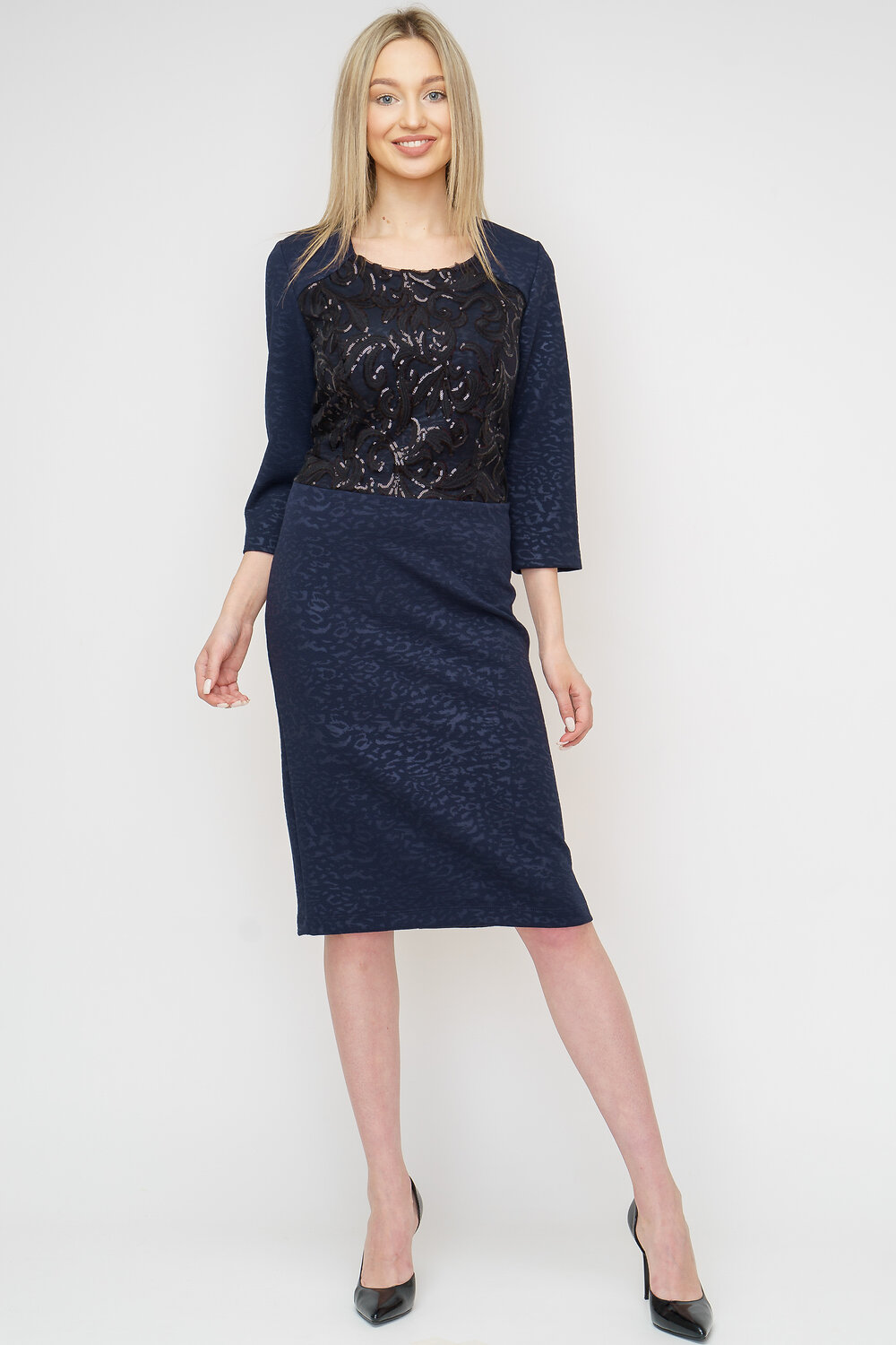 Женское платье полуприталенного силуэта. Лиф платья двухслойное - кружевное плотно с пайетками. Рукава 3/4.