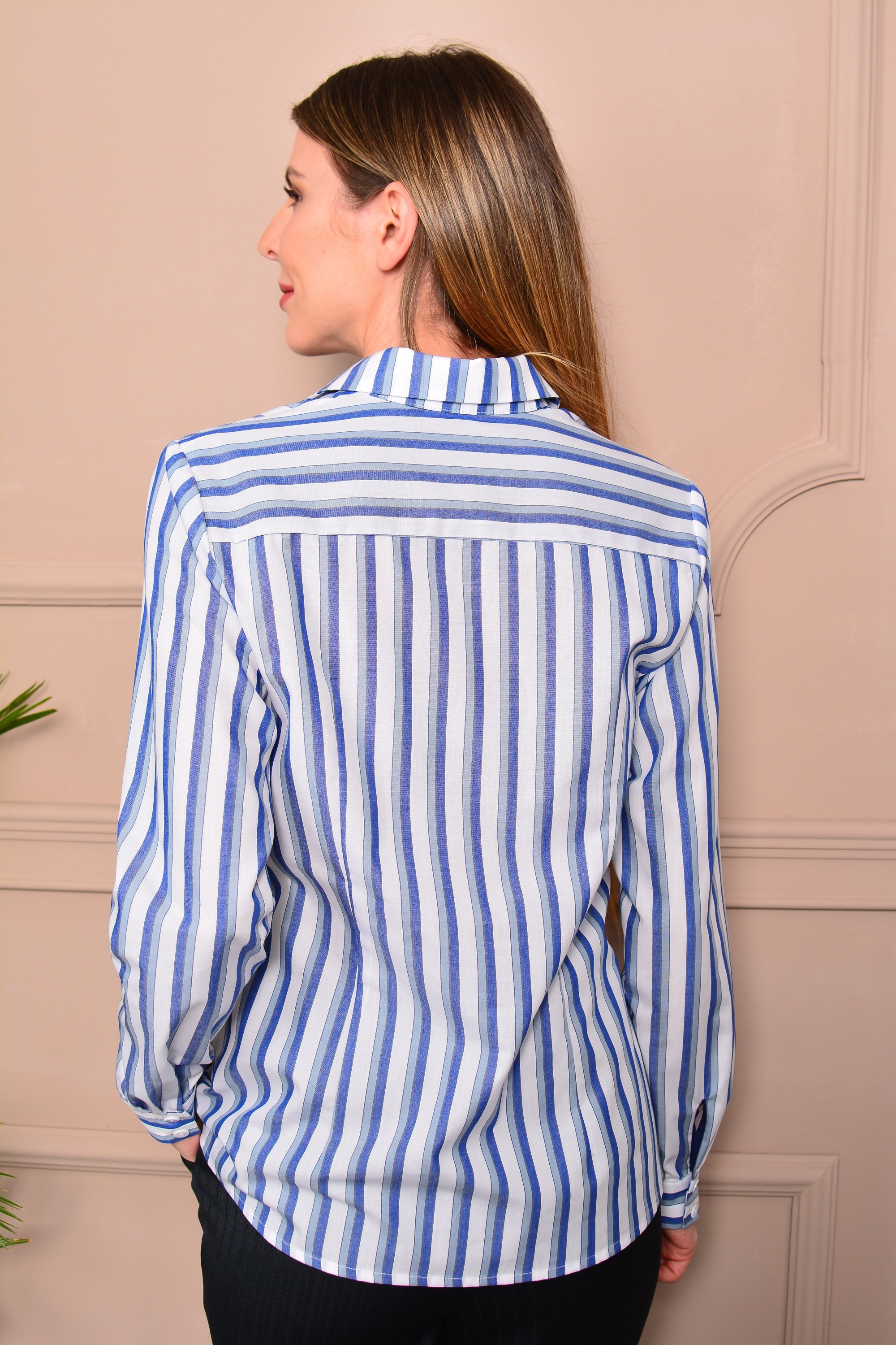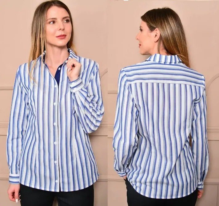 Стильная блузка приталенного силуэта из ткани в полоску с декоративной планкой на пуговицах. По передним полочкам расположены нагрудные и талиевые вытачки. По спинке кокетка и талиевые вытачки. Воротник рубашечного типа с отрезной стойкой. Рукав с углубленной проймой, втачной, длиной 60 см, заканчивается манжетой с застежкой на две пуговицы. Низ рубашки закруглённый. Длина изделия по спинке 65,5 см. Фурнитура и материалы отделки могут незначительно отличаться от тех, что на фотографии.