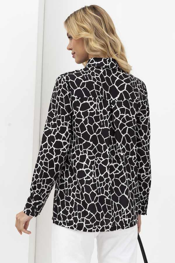 Блуза из блузочной ткани. Свободный силуэт с разрезами в боковых швах и застёжкой на пуговицы. На задней части изделия выполнена кокетка с небольшой складкой. Вырез горловины обработан отложным воротником на стойке. Втачной рукав на манжете с застёжкой на пуговицы. Достоинство этой модели в способности скрыть некоторые недостатки фигуры.