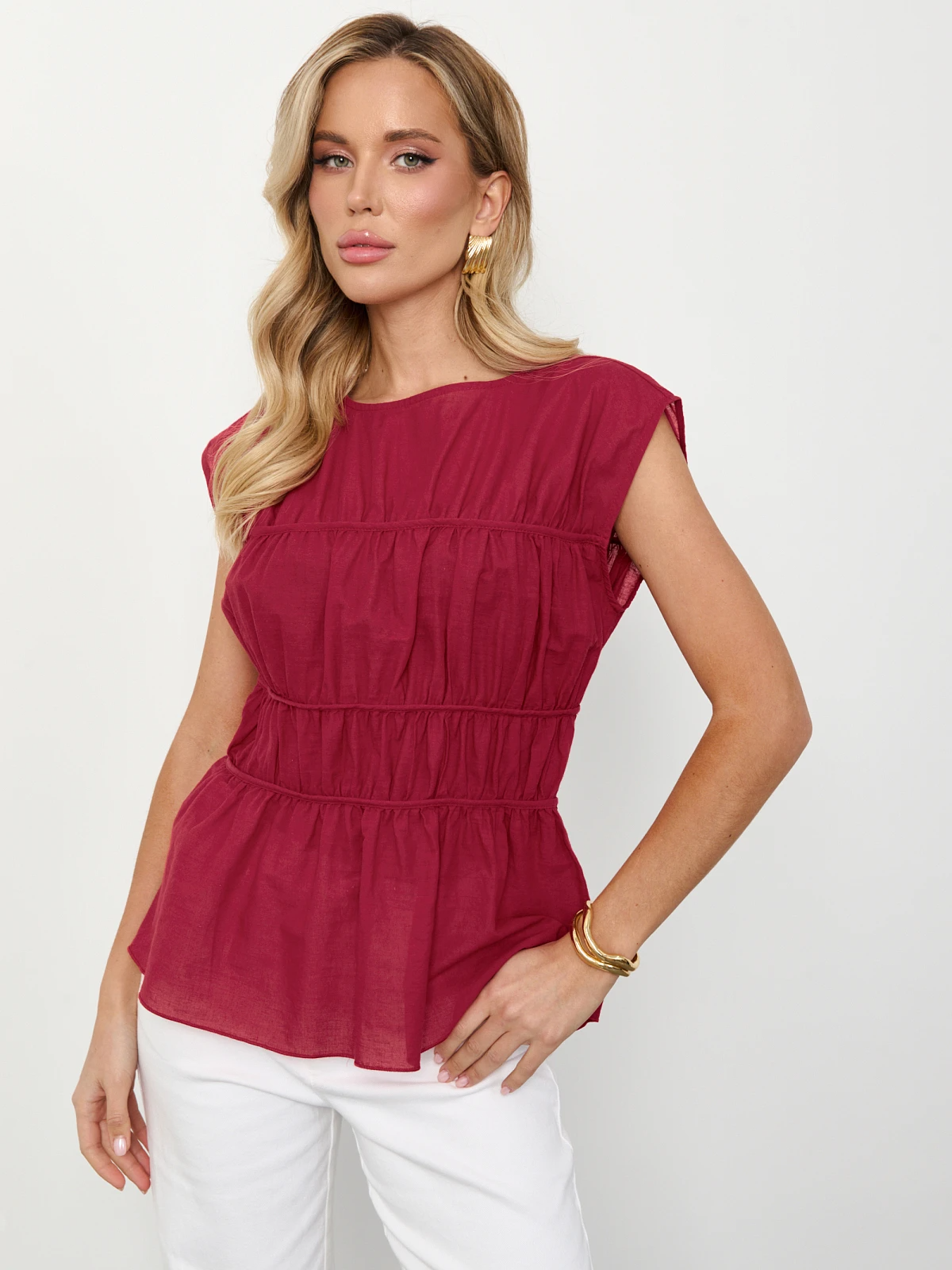 Блуза из хлопка с декоративными горизонтальными отстрочками по всему изделию.