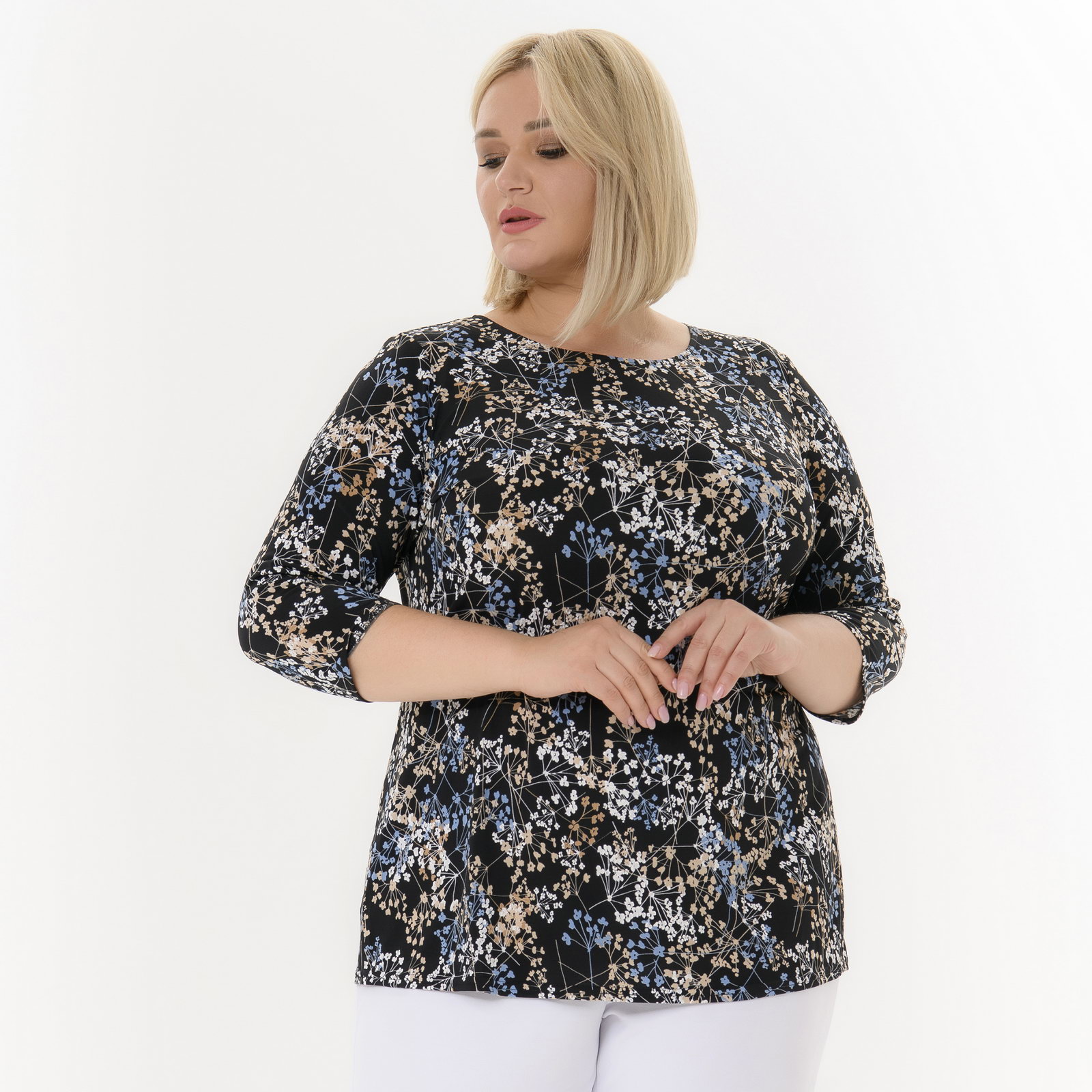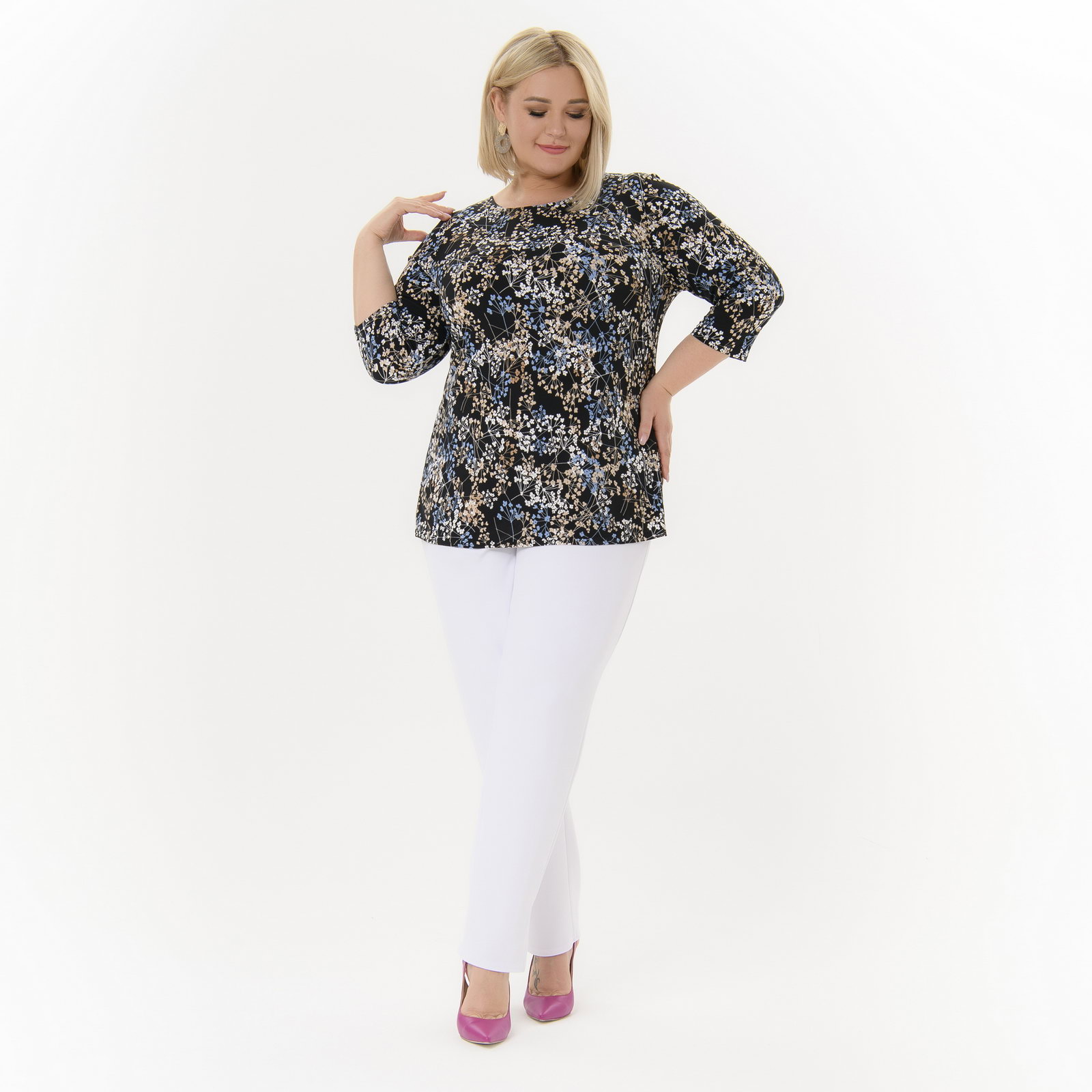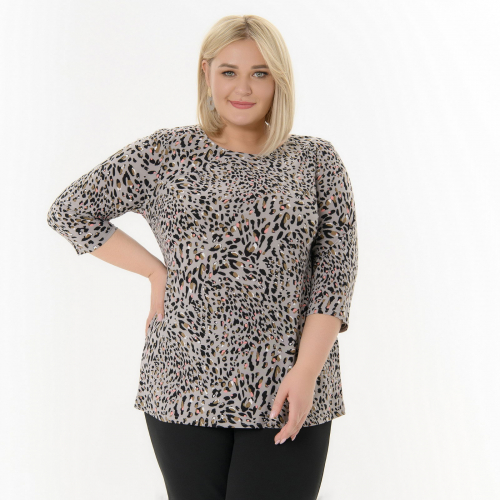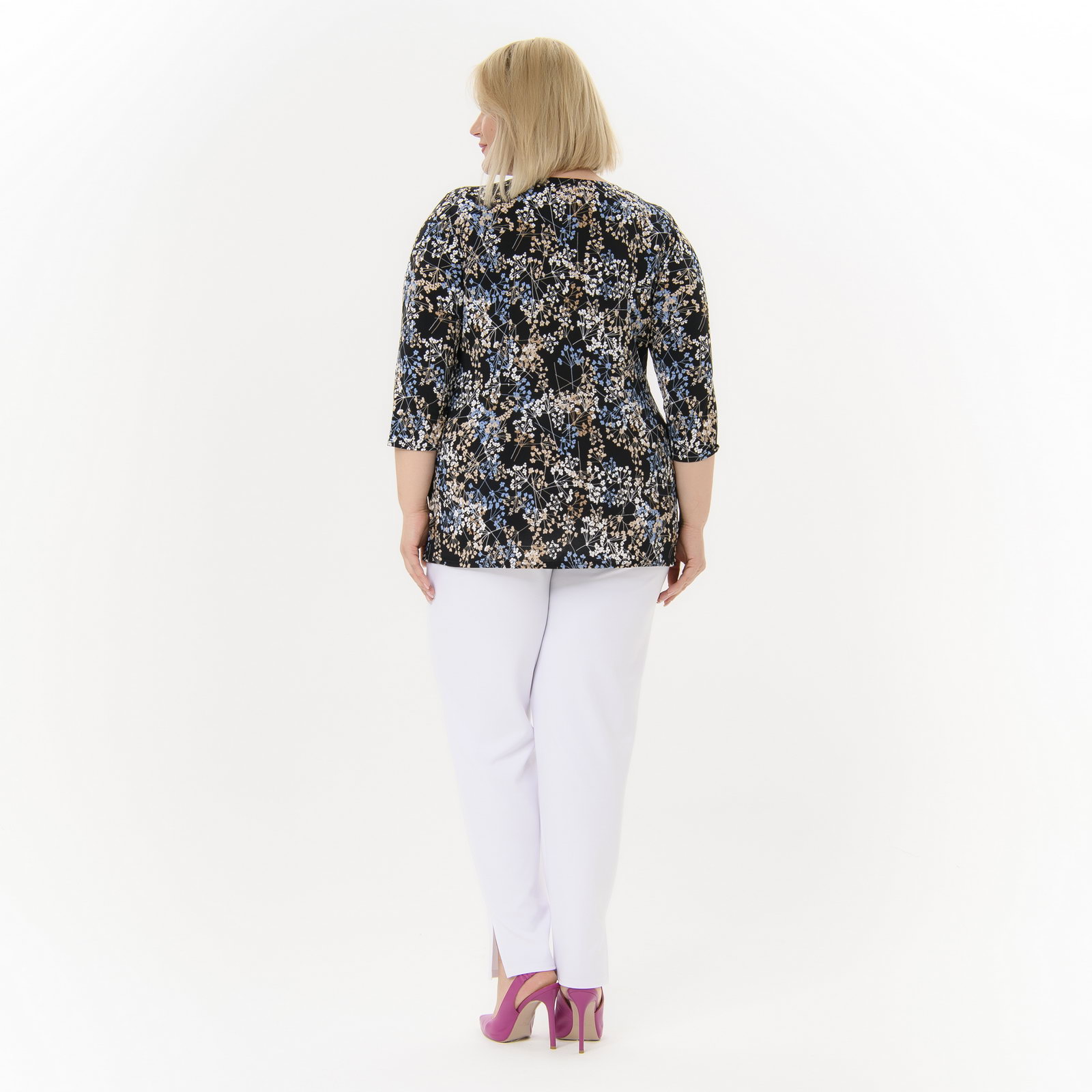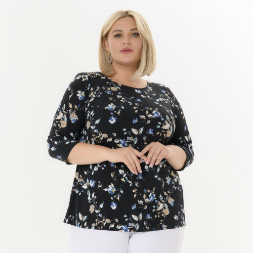 Базовая блуза из принтованного трикотажа "масло". Силуэт полуприлегающий. Вырез горловины округлый. Рукав 3/4.