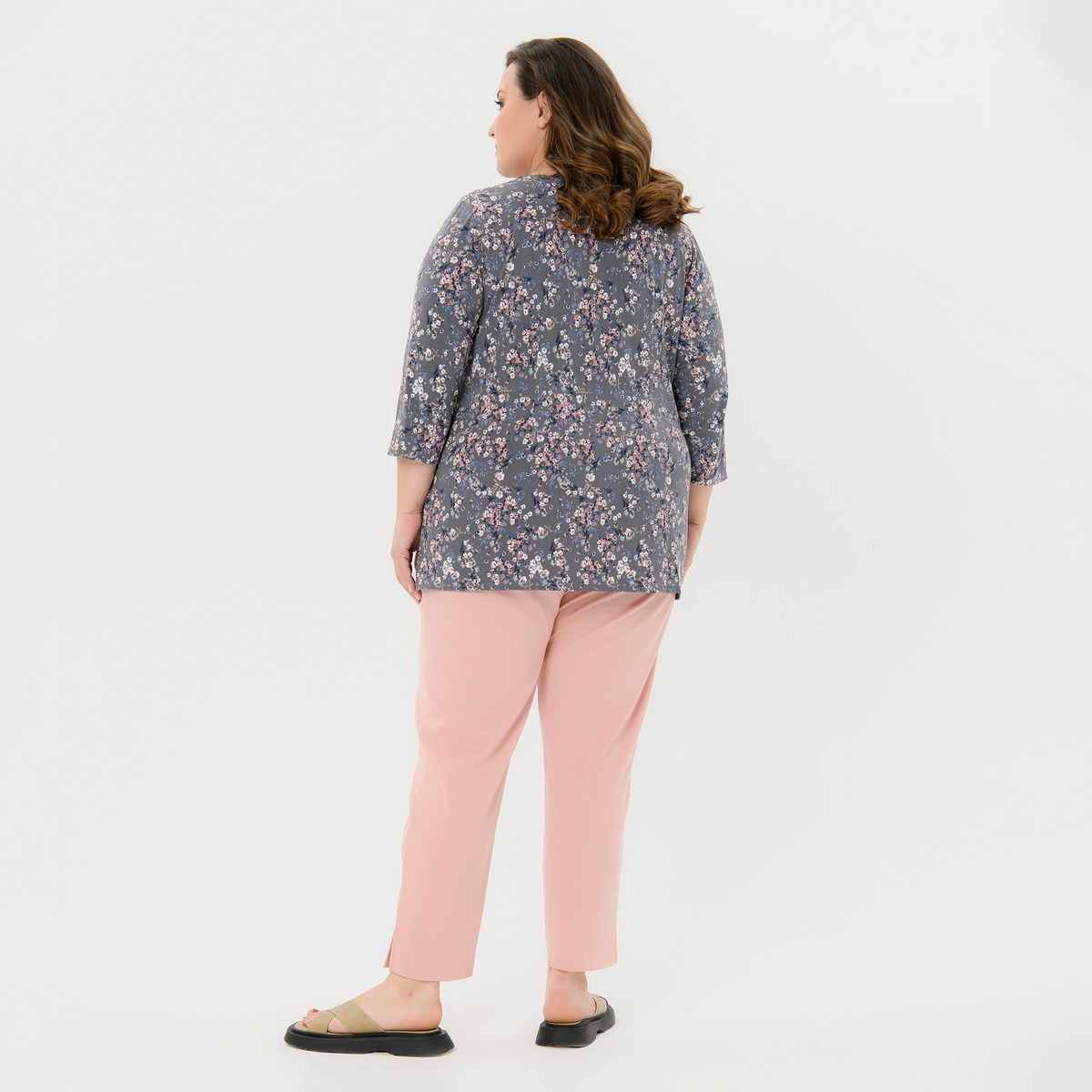 Базовая блуза из принтованного трикотажа "масло". Силуэт полуприлегающий. Вырез горловины округлый. Рукав 3/4.