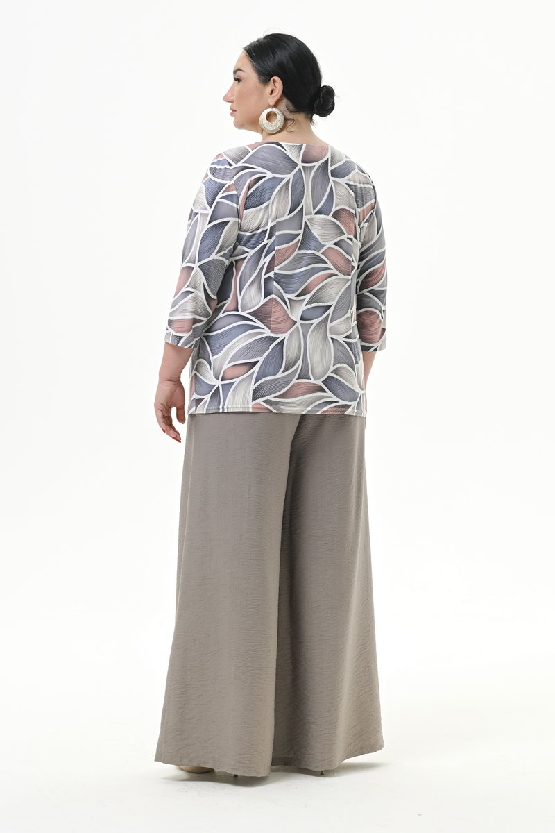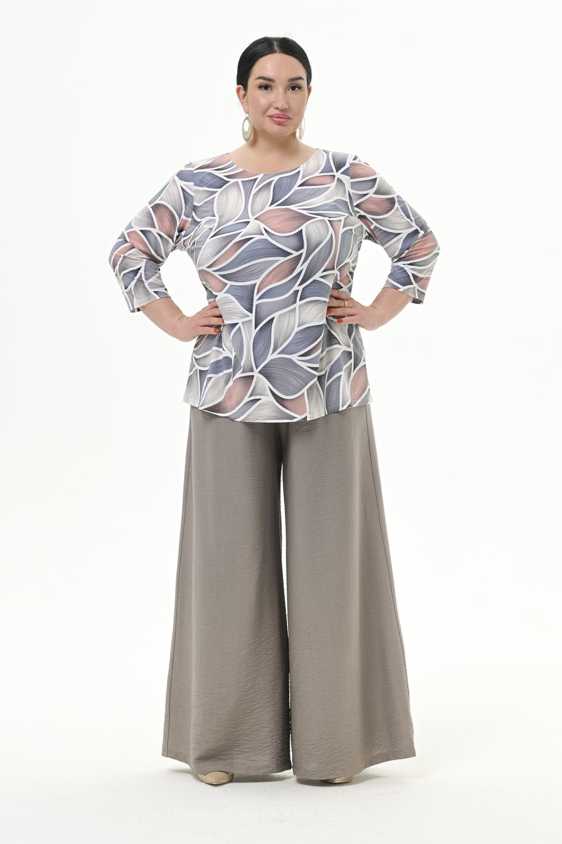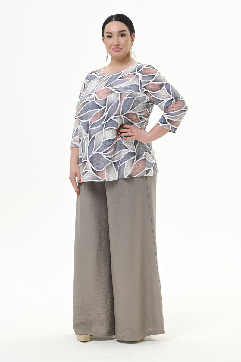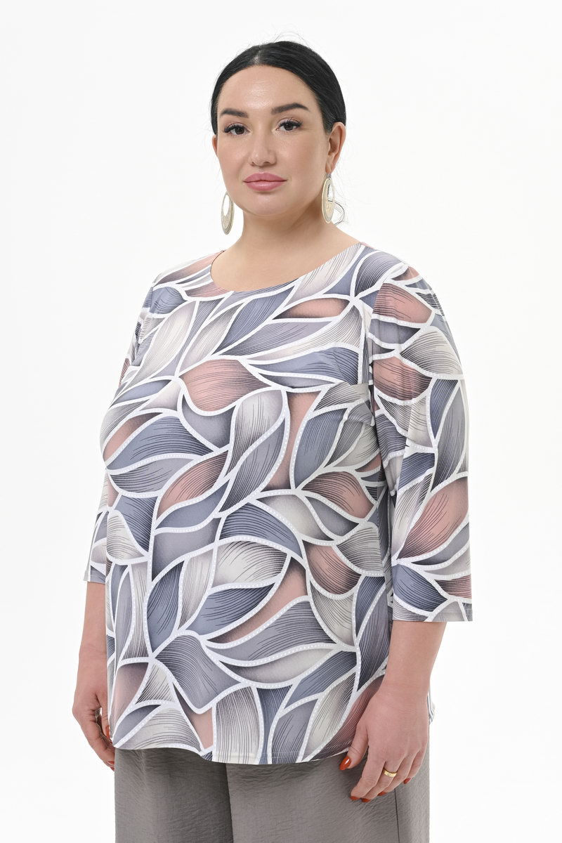 Базовая блуза из принтованного трикотажа "масло". Силуэт полуприлегающий. Вырез горловины округлый. Рукав 3/4.
