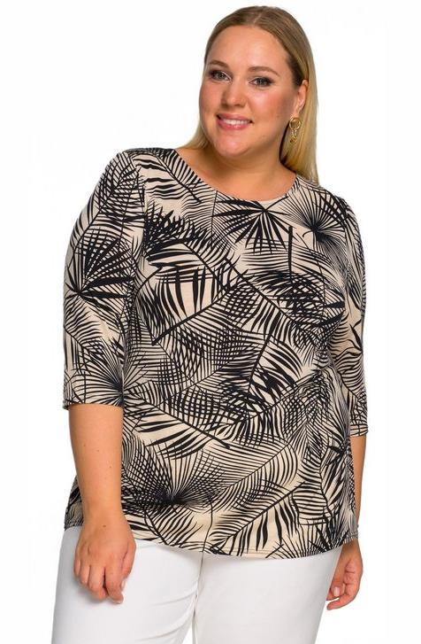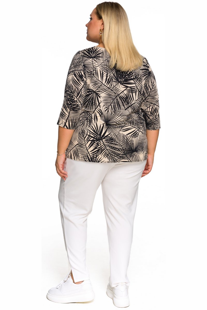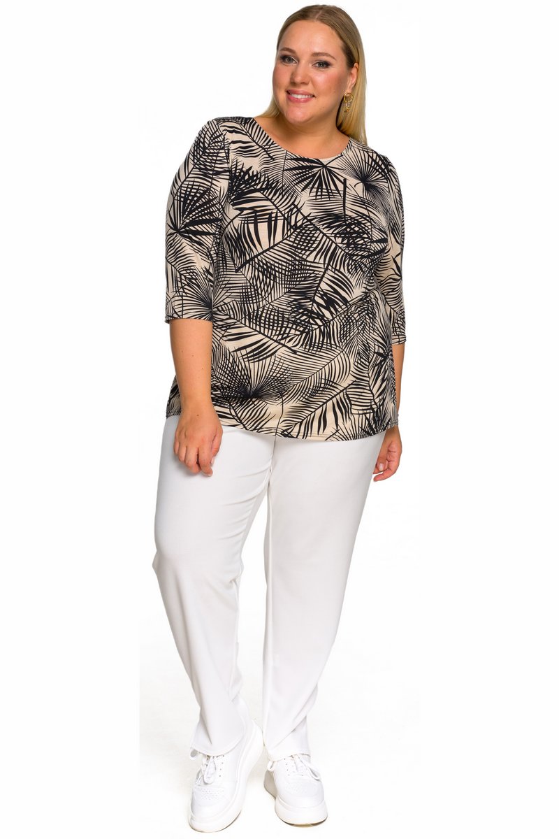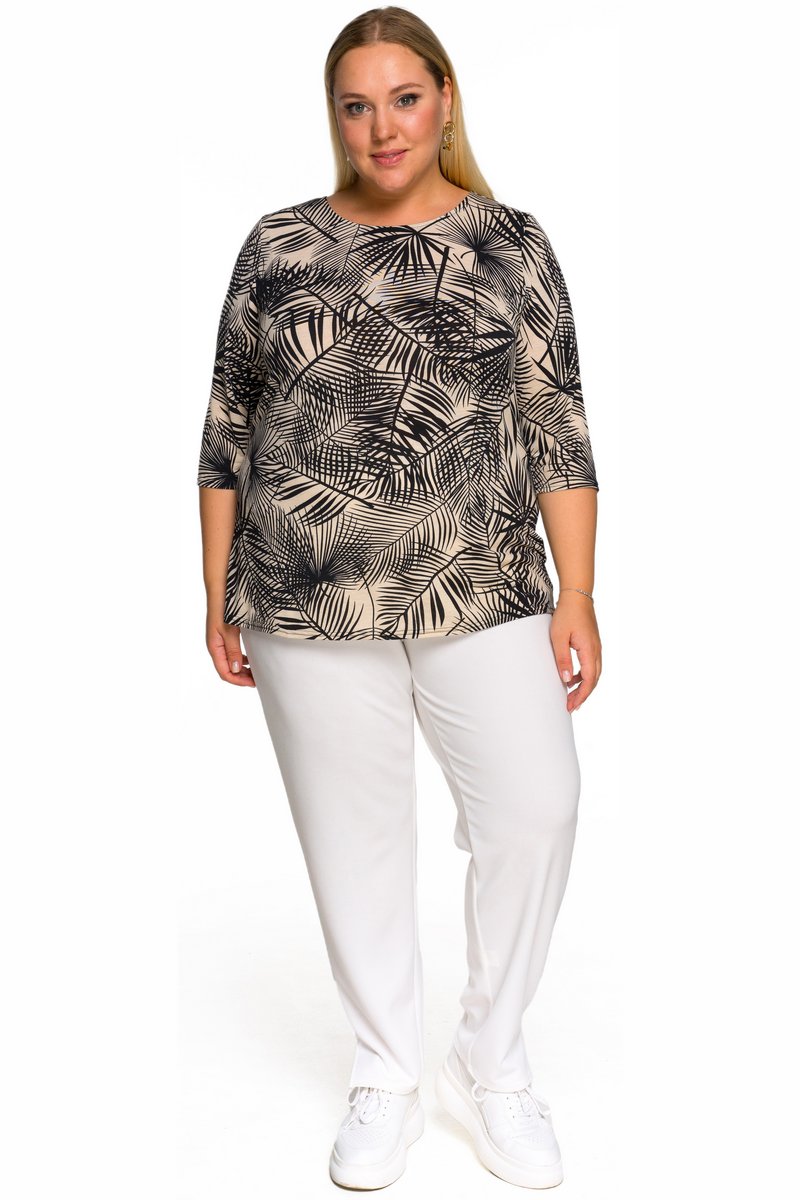 Базовая блуза из принтованного трикотажа "масло". Силуэт полуприлегающий. Вырез горловины округлый. Рукав 3/4.
