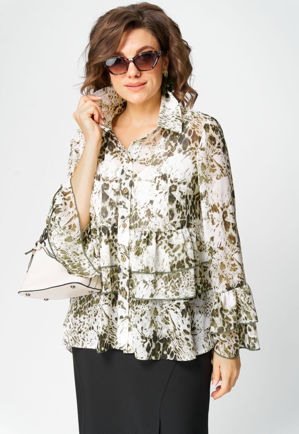 Блуза женская шикарная нарядно - повседневнаая полуприлегающего силуэта на подклдке, выполнена из красивого шифона с принтом. Вырез горловины воротник на стойке рубашечного типа, рукав втачной по низу с притачными воланми. Застежка доверху на обметанные петли и пуговицы, низ блузы фигурный (по спинке длиннее). По переду блузы притачные воланы, в боковых швах обработаны разрезы. Декором блузы служит принт амой ткани и отделочные элементы в виде воланов.