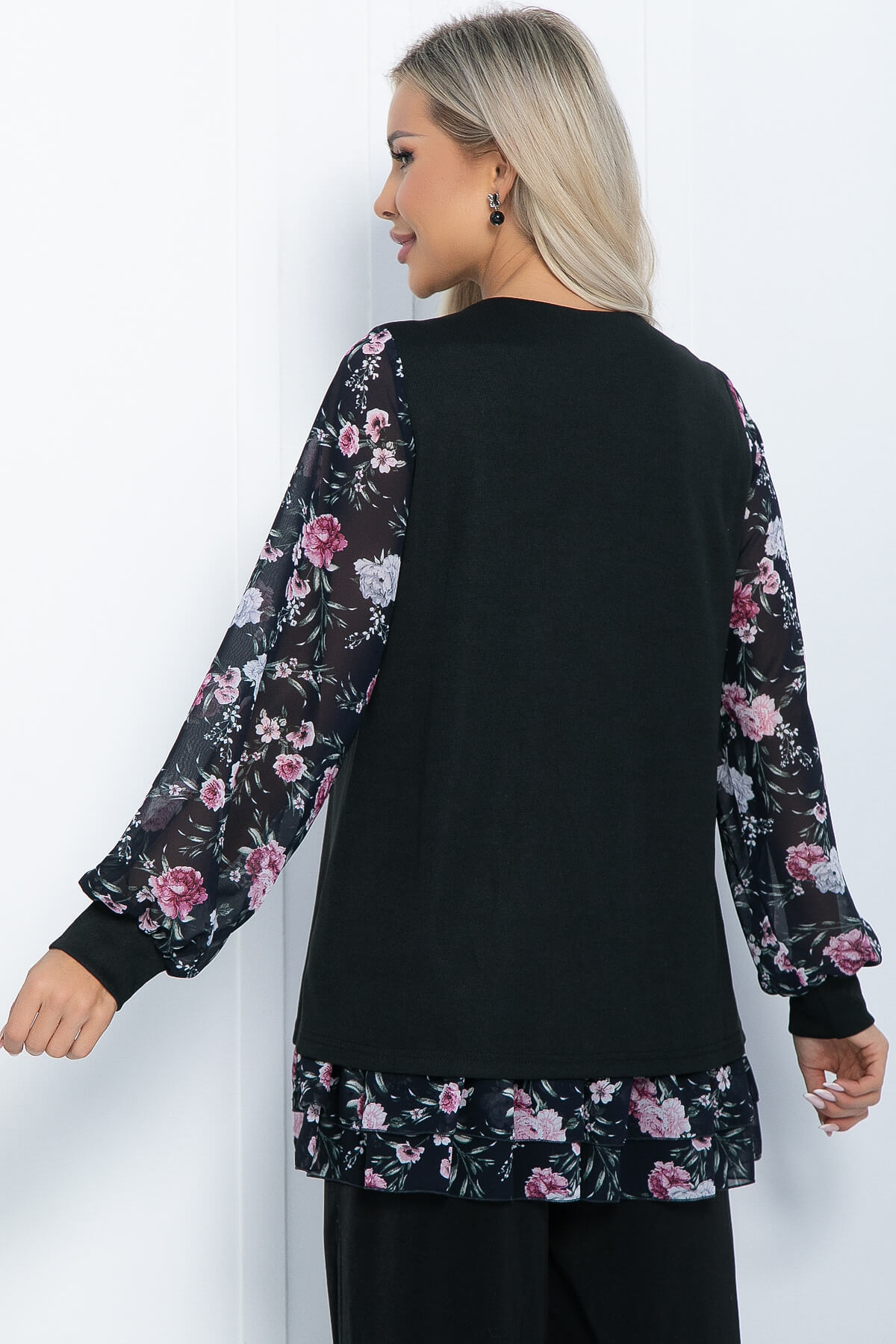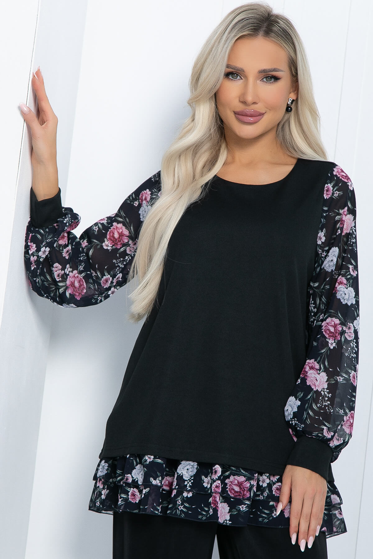 Блуза А-образного силуэта, на подкладке, выполненная из комбинированных тканей: трикотажного полотна и шифона. Рукав втачной из шифона, длинный, низ рукава на мягком манжете из трикотажного полотна. Воланы по низу блузы из шифона. Вырез округлый. А-образный силуэт и шифон придают изделию лёгкость. Блуза хорошо будет сочетаться с любым гардеробом.