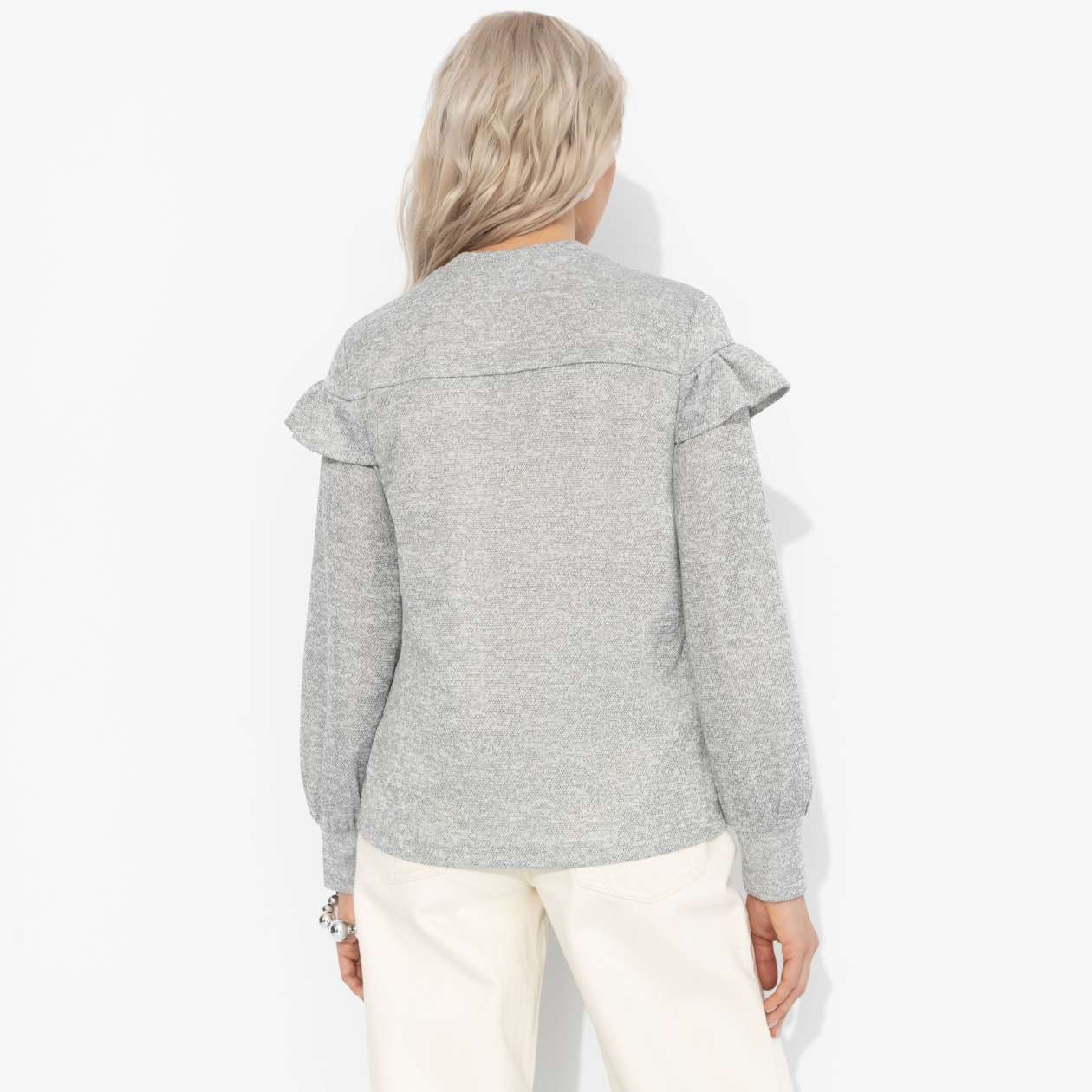 Она не ищет признания – она его получает. Мягкий свитшот комфортно садится по фигуре, создавая ощущение уюта. Рюша по линии груди добавляет романтики и свежести образу. Прямой силуэт, манжеты на резинке и безупречный серый оттенок – идеальное сочетание простоты и шарма.