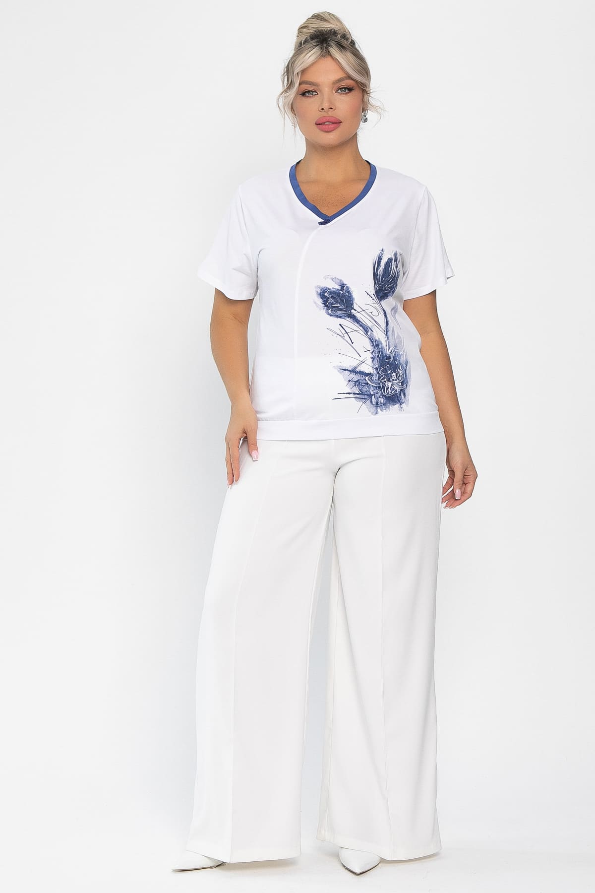 Футболка с принтом в бело-синем цвете — это универсальная вещь, которая станет отличным дополнением к вашему гардеробу. Она подойдёт как для уютного домашнего отдыха, так и для активных прогулок по городу. Комбинируйте её с джинсами, шортами или юбками — и вы всегда будете выглядеть стильно и привлекательно.