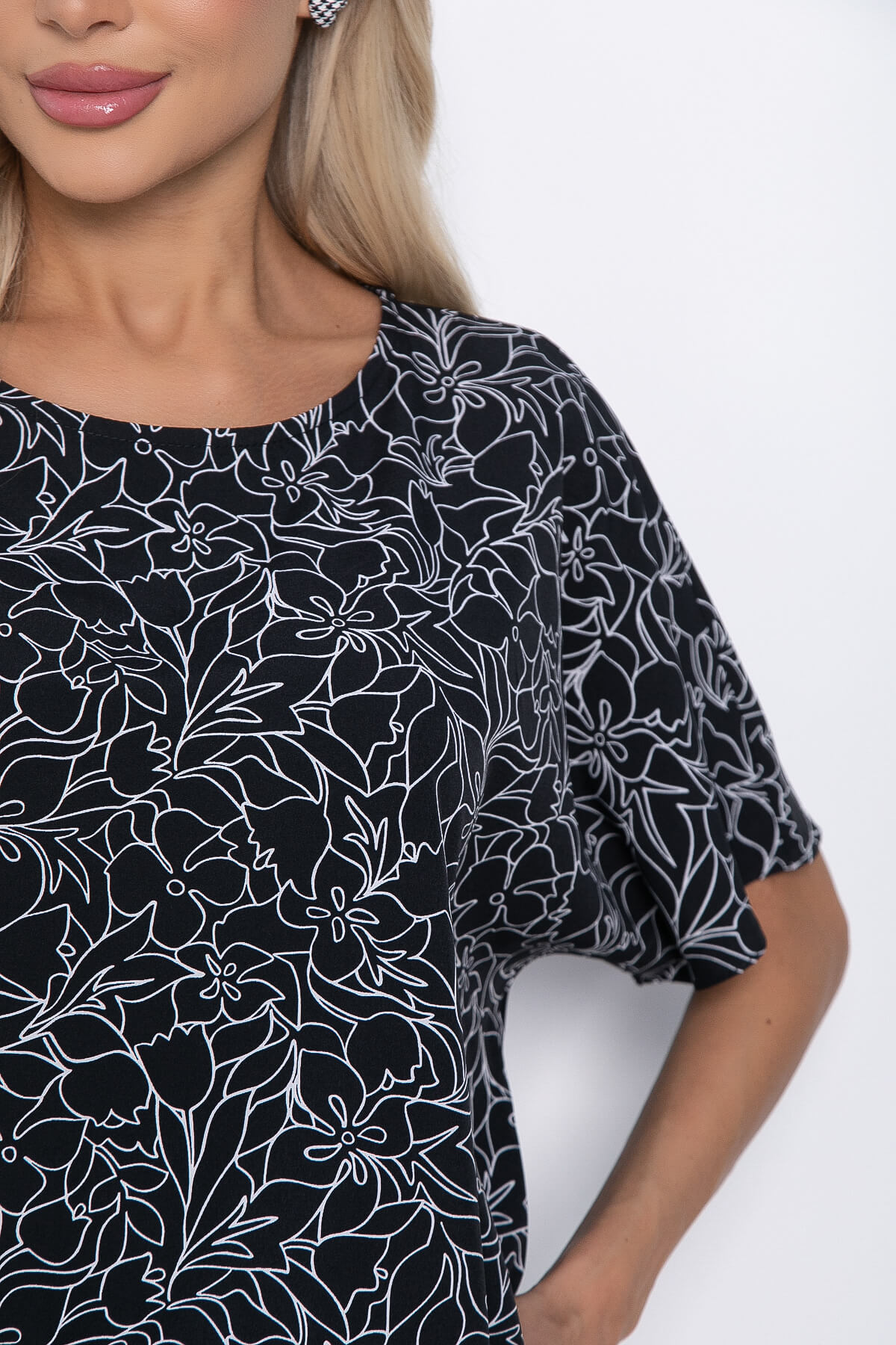 Блузка с цветочным принтом станет отличным дополнением в вашем гардеробе! Её легко сочетать с брюками, джинсами или юбкой. Также можно надеть под пиджак или жакет. Модель свободного кроя с цельнокроеным рукавом и округлым вырезом. Она подходит для повседневных образов и для домашнего использования. Благодаря своему свободному крою она обеспечит комфорт и свободу движения. По бокам разрезы. Передняя часть короче задней.