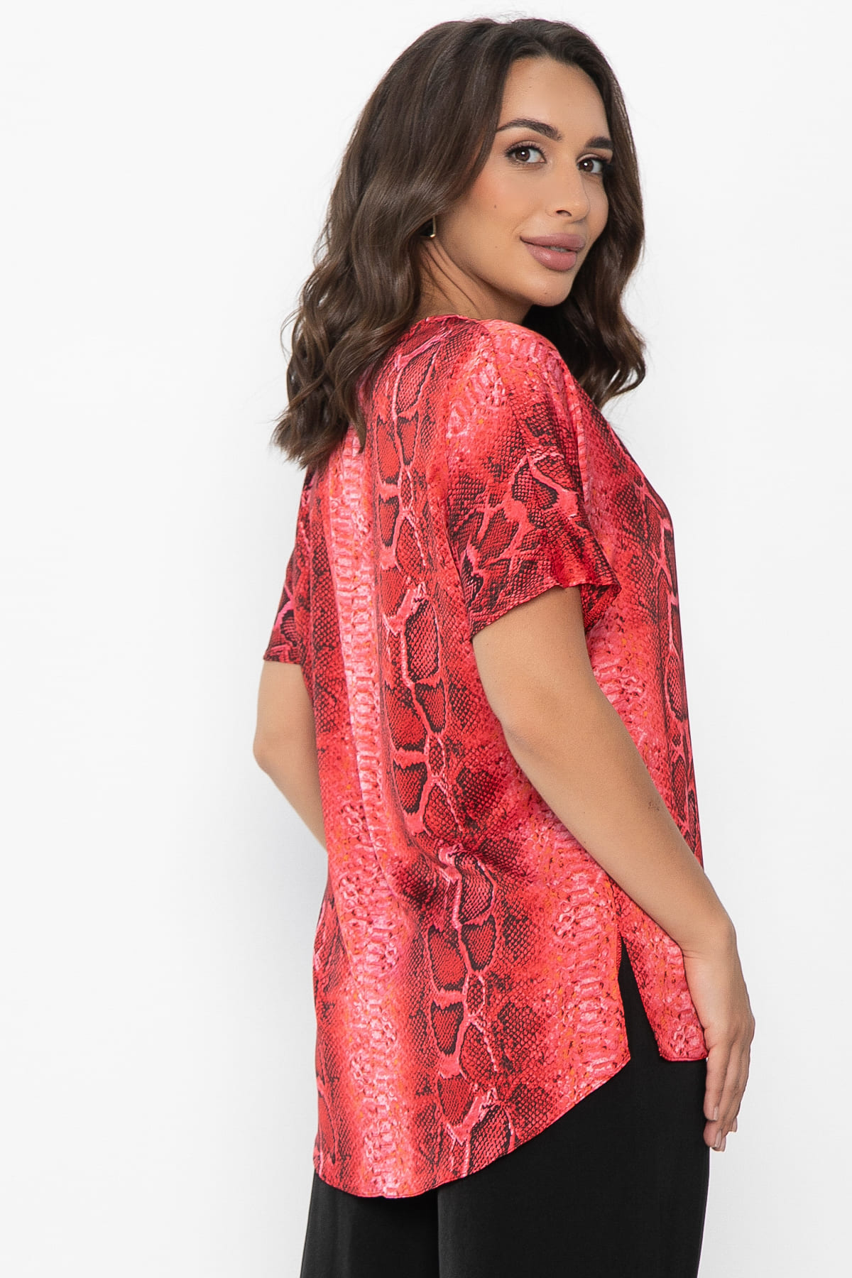 Выделитесь из толпы с нашей изысканной женской блузкой с изящным принтом рептилии. Эта модель станет отличным выбором для создания стильных и запоминающихся образов. Свободный крой, цельнокроеные рукава и округлый вырез обеспечивают комфорт и свободу движений. Принт рептилии привлекает внимание и добавляет образу очарования. По бокам блузки предусмотрены разрезы, а передняя часть короче задней.