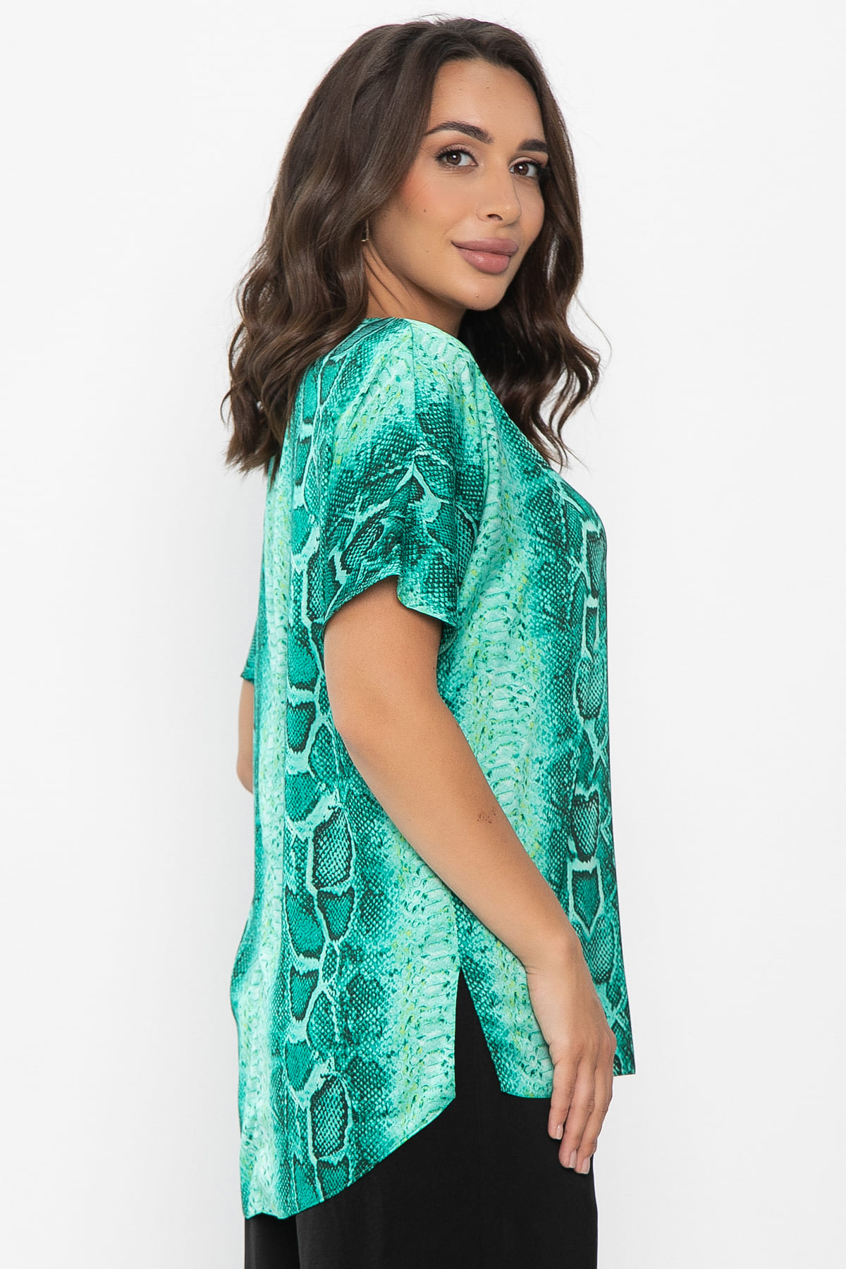 Выделитесь из толпы с нашей изысканной женской блузкой с изящным принтом рептилии. Эта модель станет отличным выбором для создания стильных и запоминающихся образов. Свободный крой, цельнокроеные рукава и округлый вырез обеспечивают комфорт и свободу движений. Принт рептилии привлекает внимание и добавляет образу очарования. По бокам блузки предусмотрены разрезы, а передняя часть короче задней.