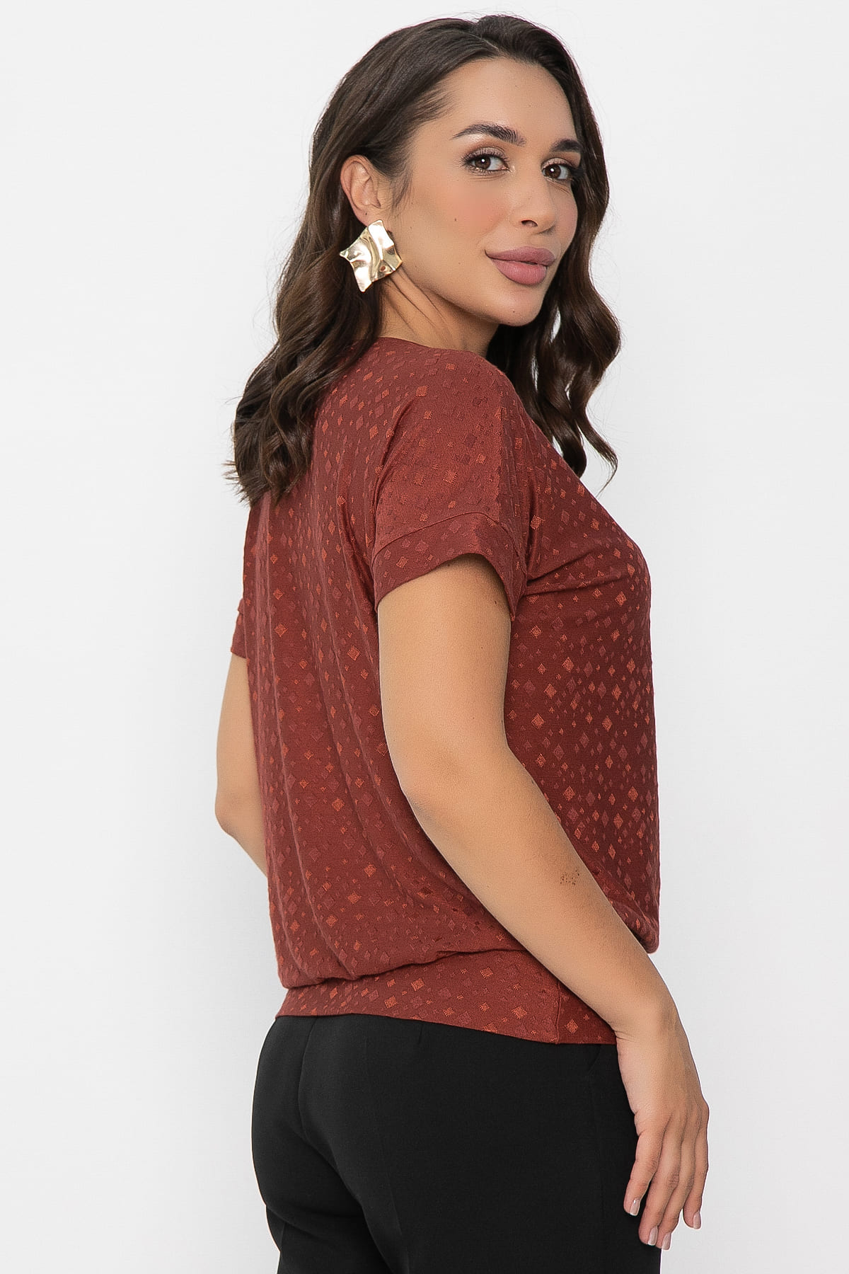 Встречайте изысканную блузку в терракотовом оттенке. Этот элемент гардероба станет вашим универсальным спутником. Свободный крой обеспечивает удобство и свободу движений, а круглый вырез добавляет образу элегантности. Спущенный рукав с притачной манжетой придает модели особый шарм. Низ блузы на широкой ножке.