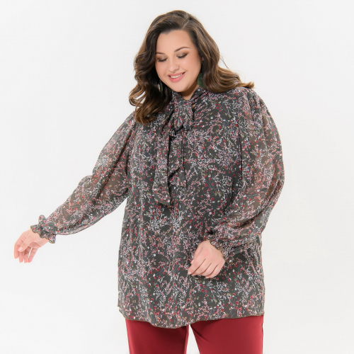 Блуза из струящегося трикотажа "масло". Силуэт прямой. По вырезу горловины переда заложены мягкие складочки, со стороны горловины спинки блуза застегивается на пуговку.