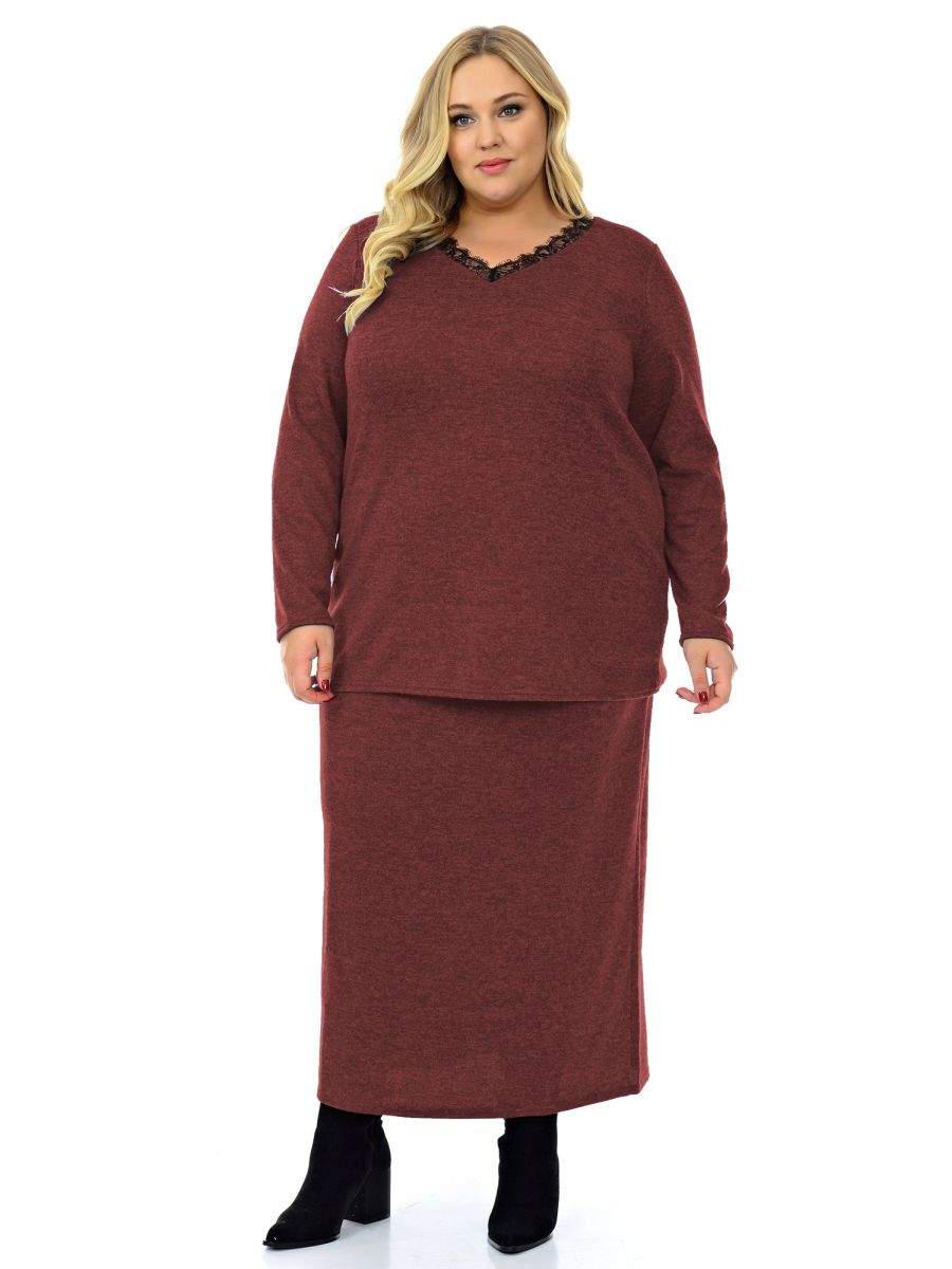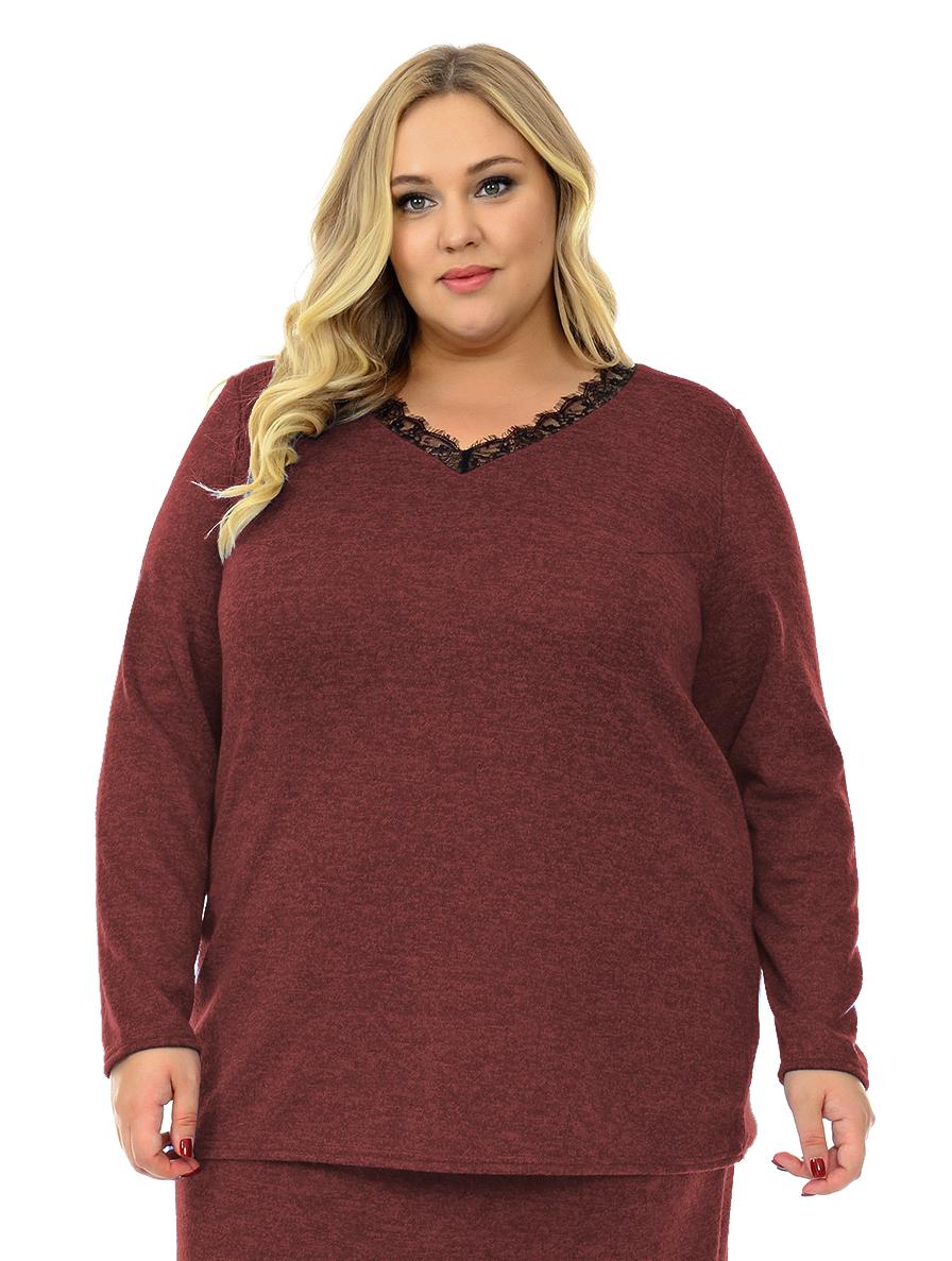 Блуза с кружевом по горловине, джерси меланж бордовый