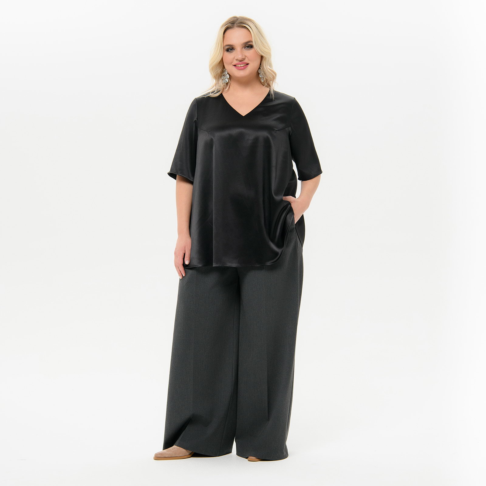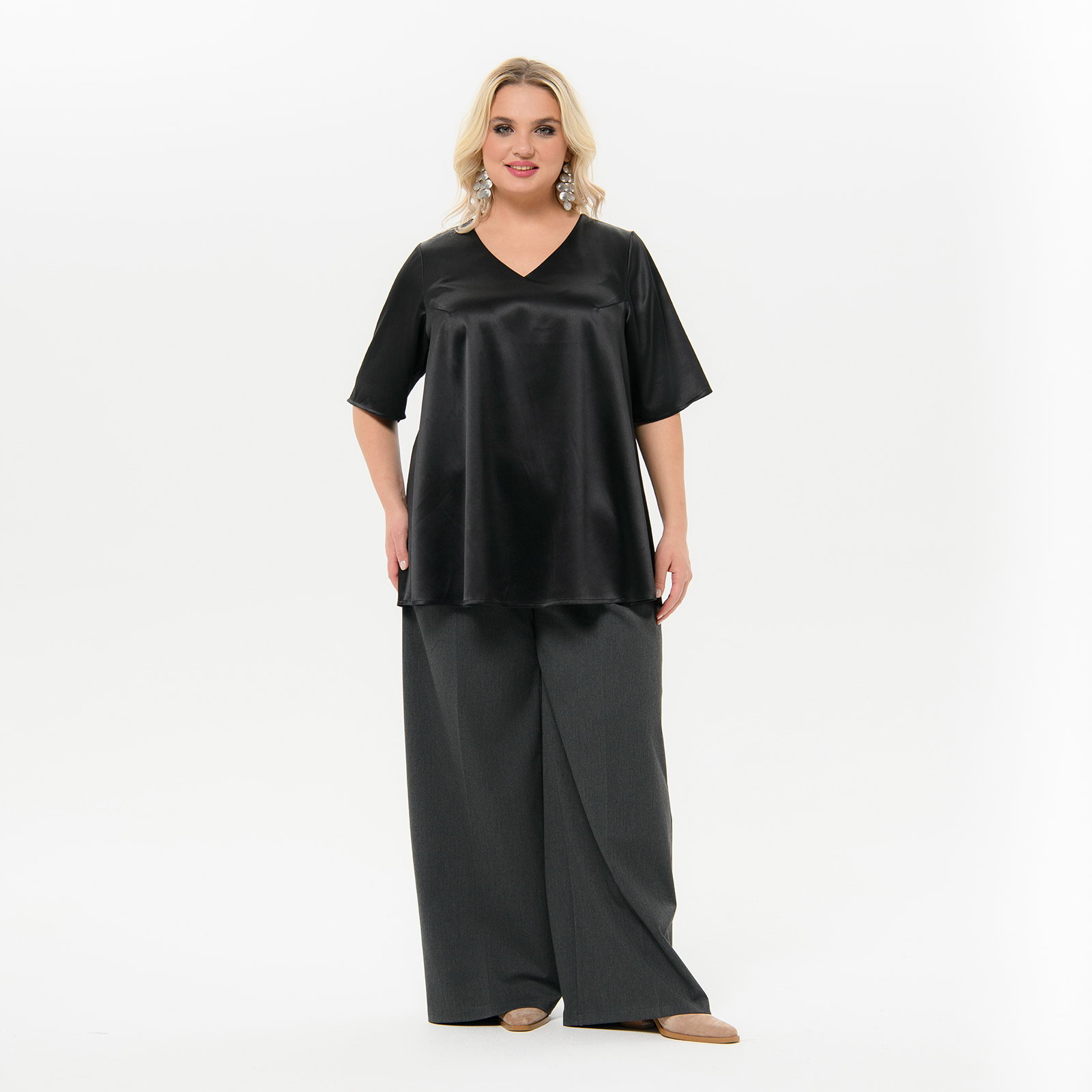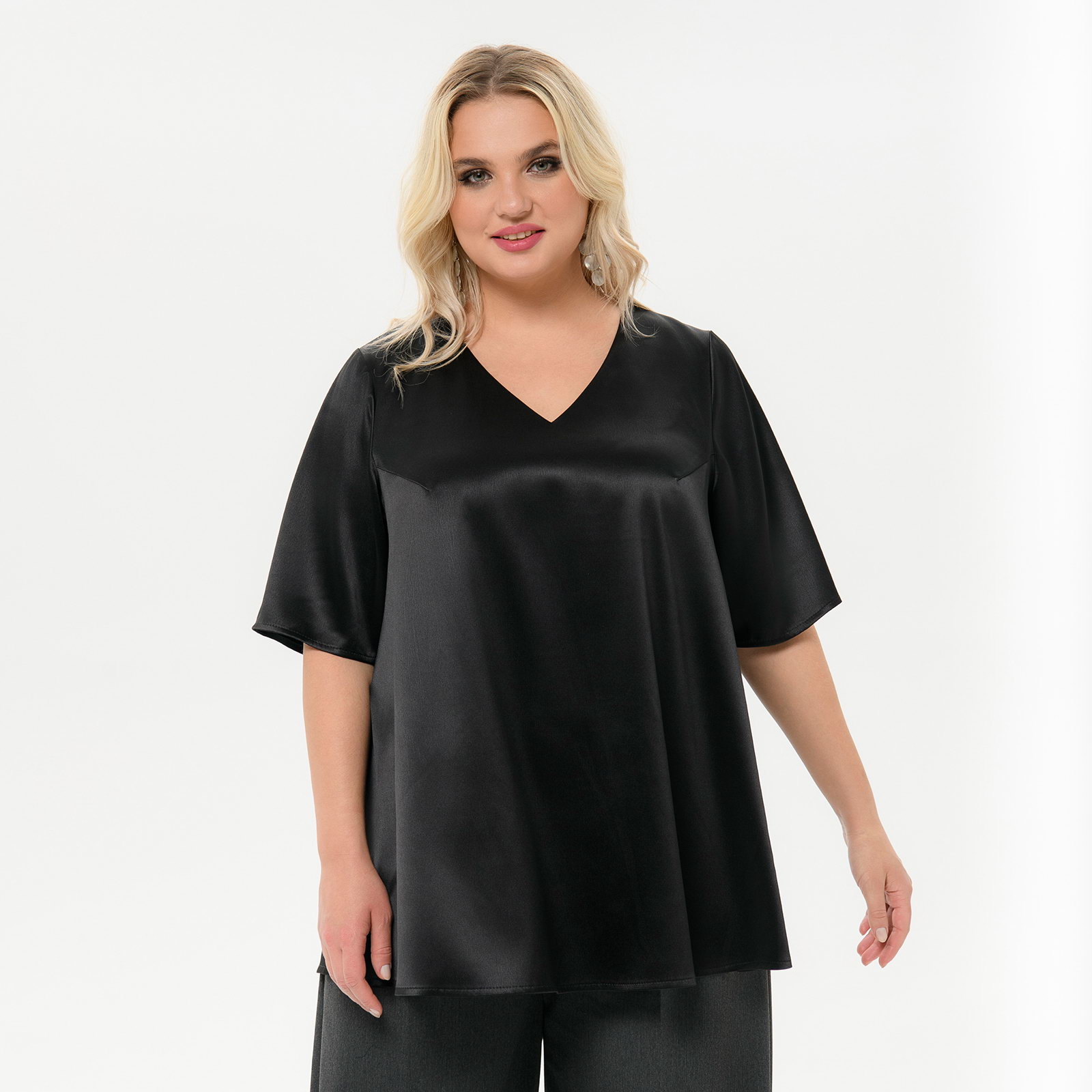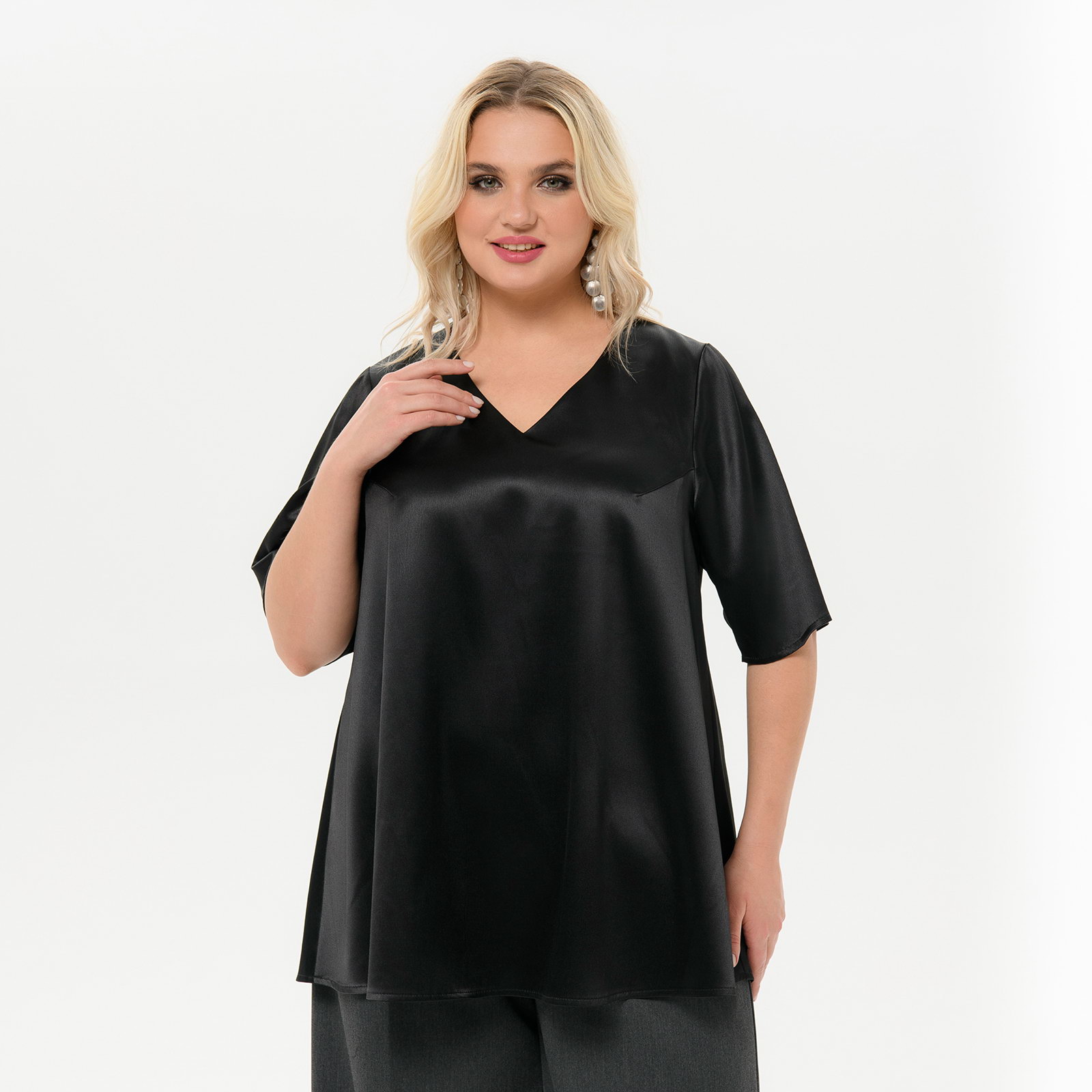 Блуза с V - вырезом А-силуэта из плотного атласа с эластаном, черная *