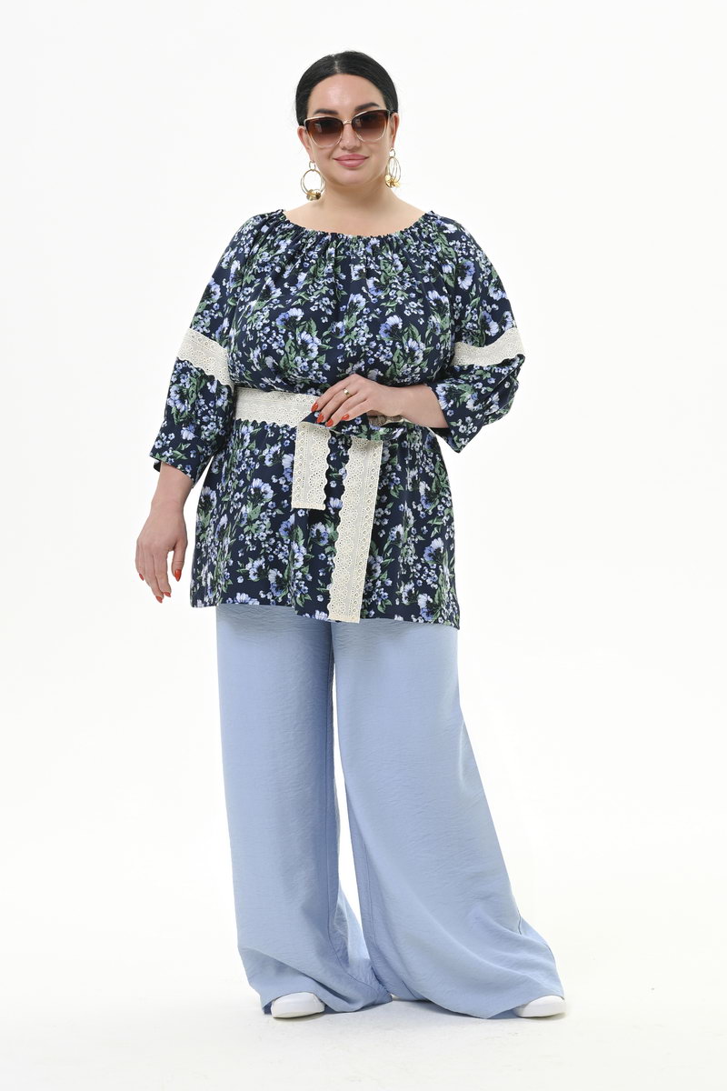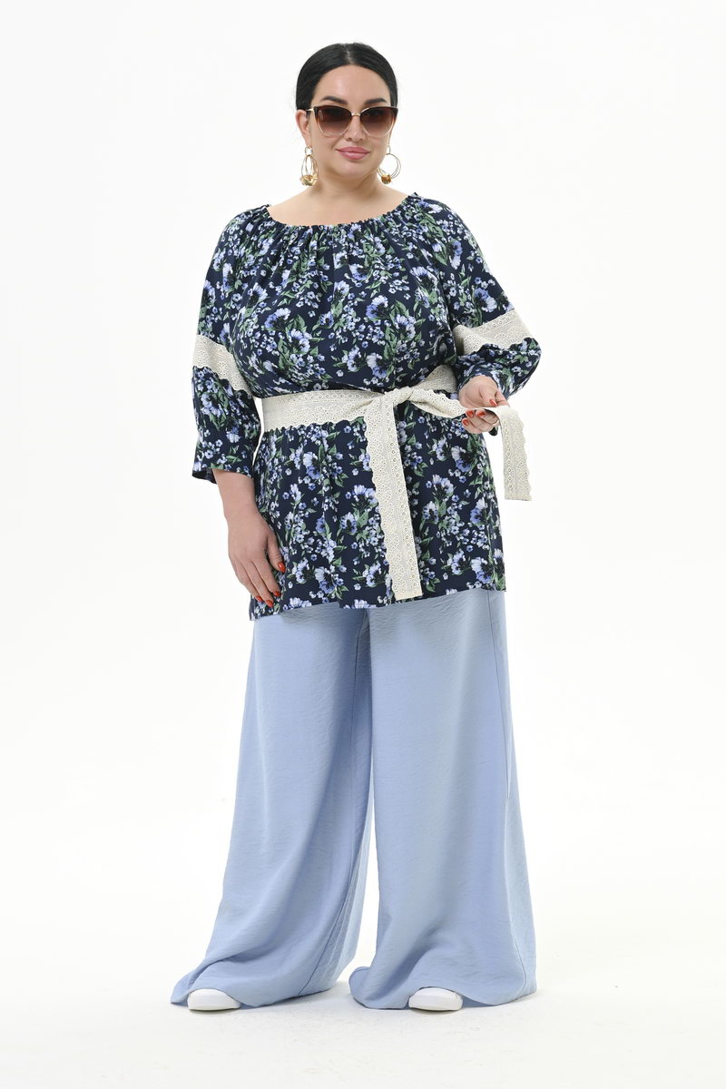 Блуза из принтованого плотного штапеля свободного силуэта. Рукав на основе реглан со вставкой из кружева. Линия горловины расширена, на резиночке, за счет чего можно приоткрыть плечи.